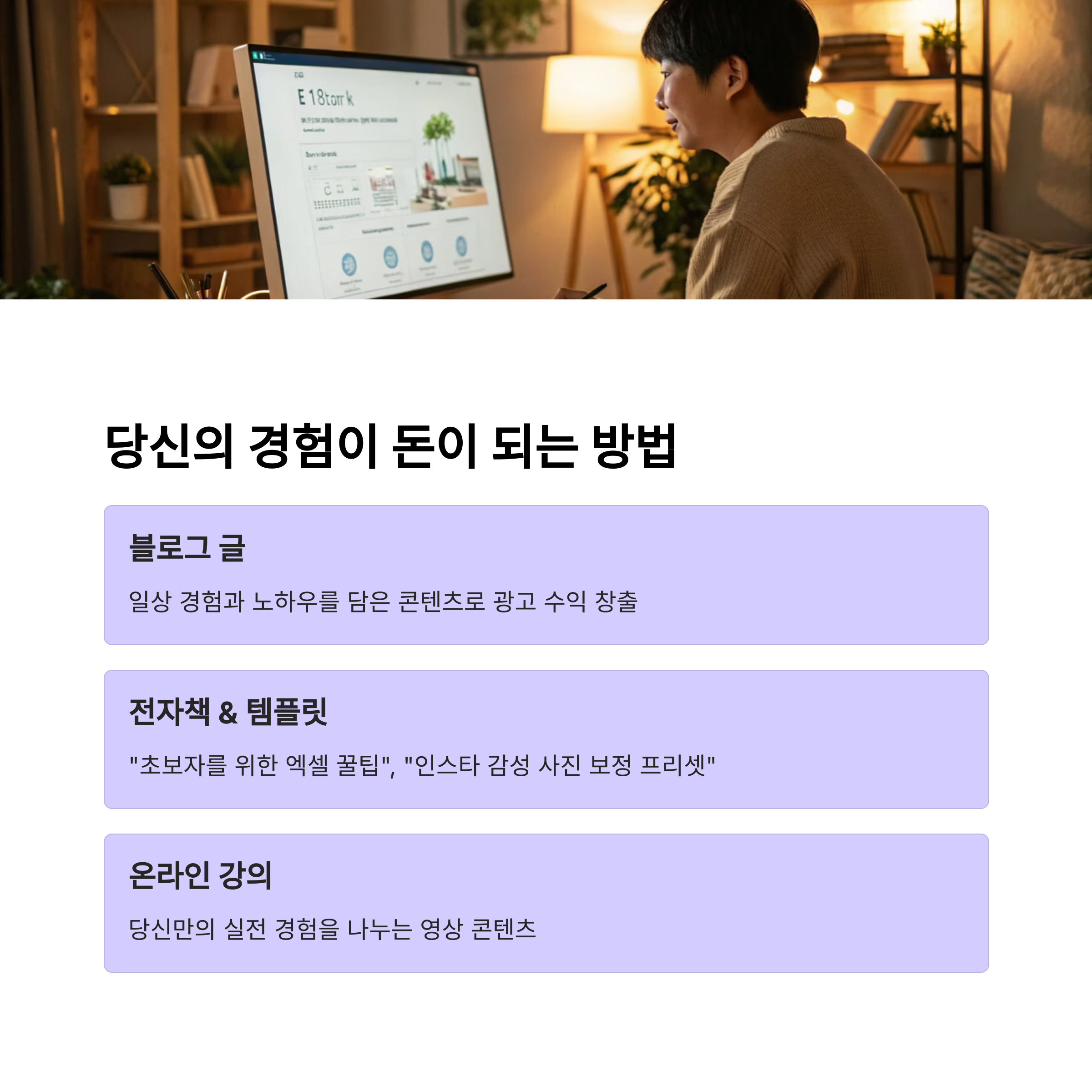 | 경험형 콘텐츠 정리 후 PDF 형태로 판매 | 블로그, 스마트스토어, 클래스101 등 플랫폼 연계 | 유입 → 소비 → 수익이 반복되는 자동 구조 설계 |