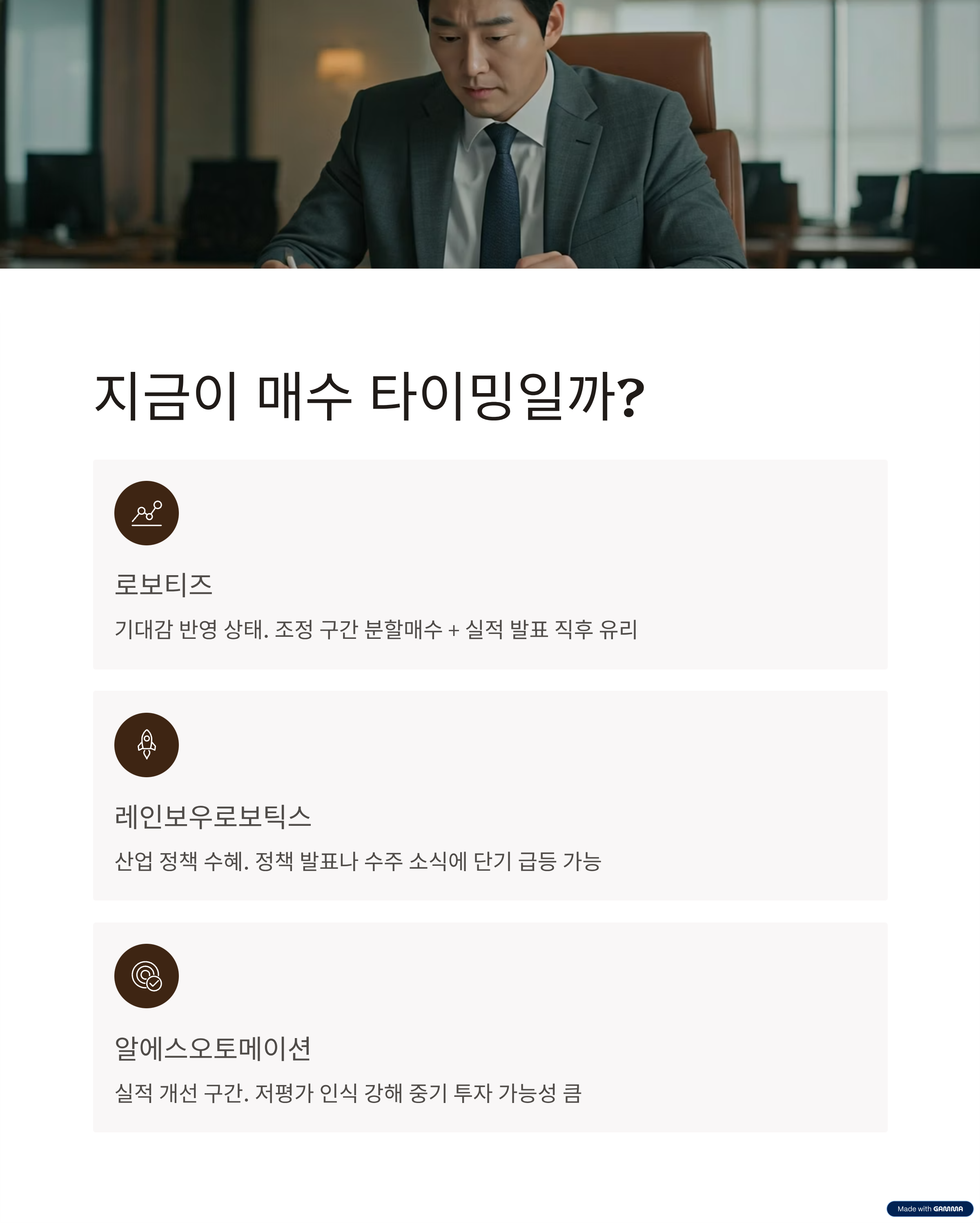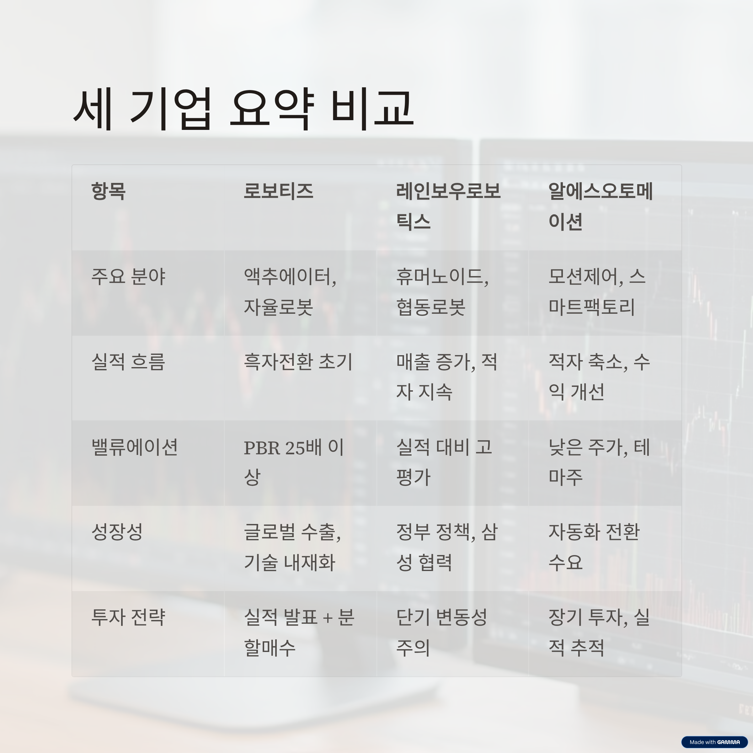 | 성장성 포인트 | 글로벌 수출, 기술 내재화 | 정부 정책·삼성 협력 | 자동화 전환 산업 수요 |