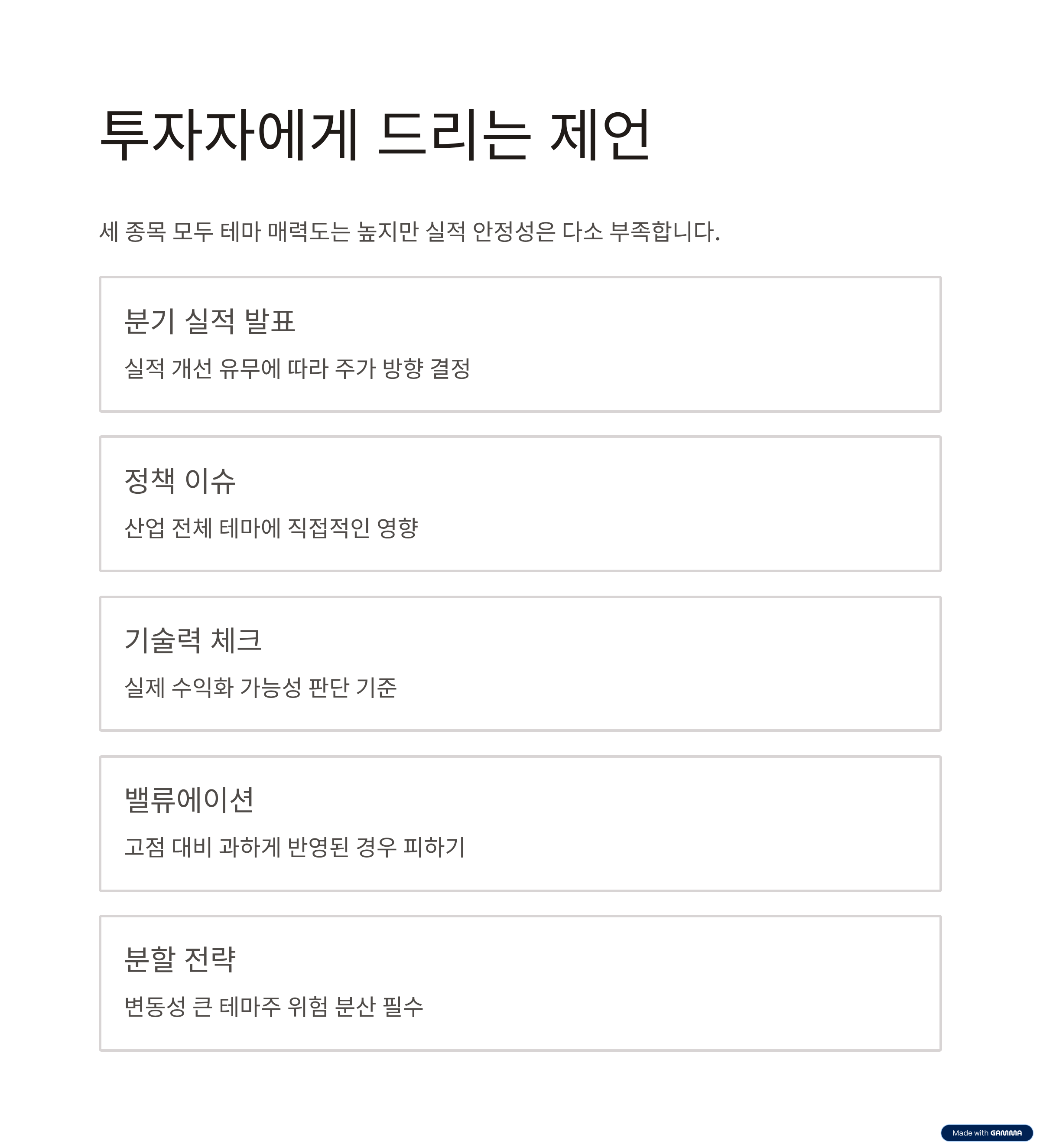 - 세 종목 모두 테마 매력도는 높지만 실적 안정성은 다소 부족합니다.