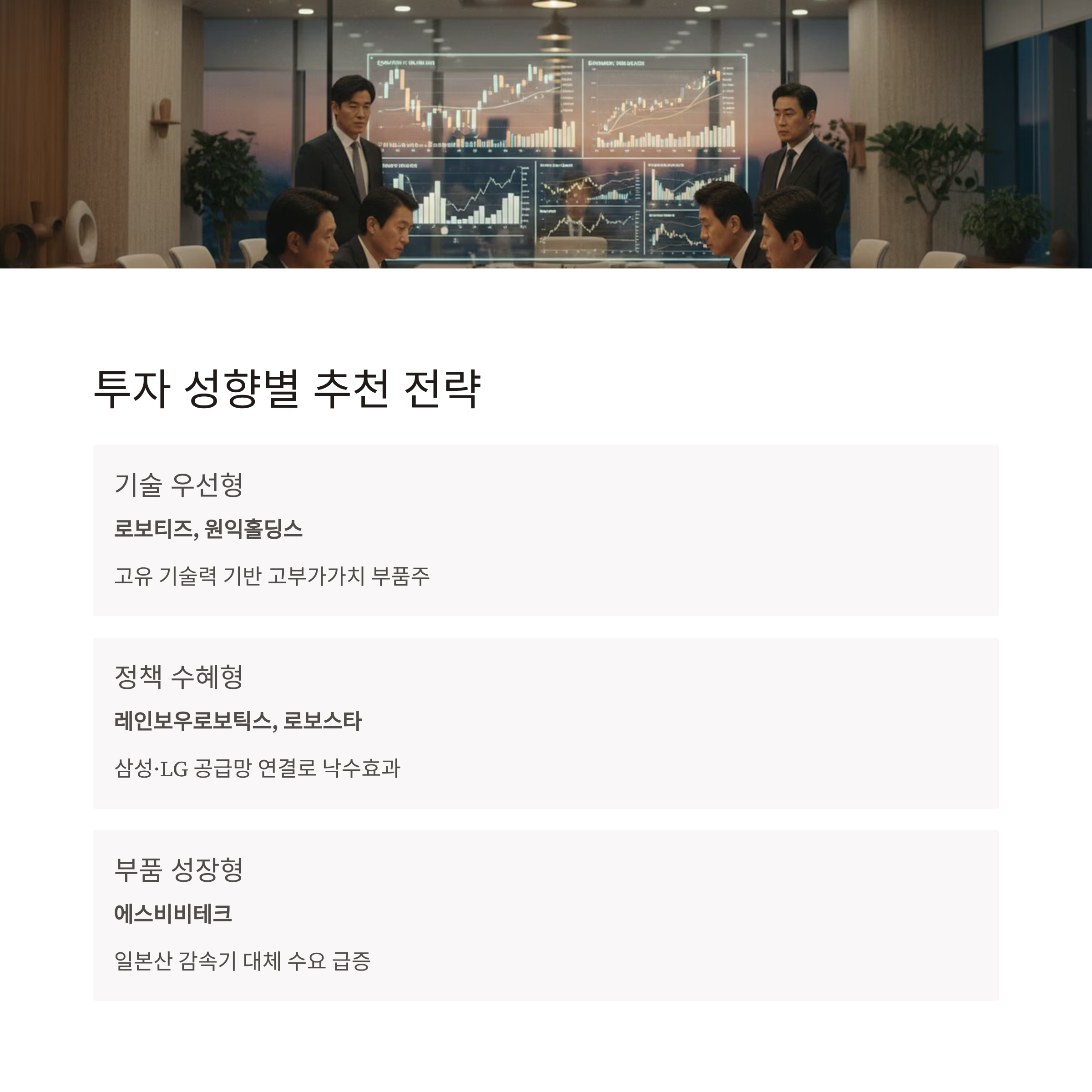 | 기술 우선형 | 로보티즈, 원익홀딩스 | 고유 기술력(액추에이터·촉각센서) 기반 고부가가치 부품주 |