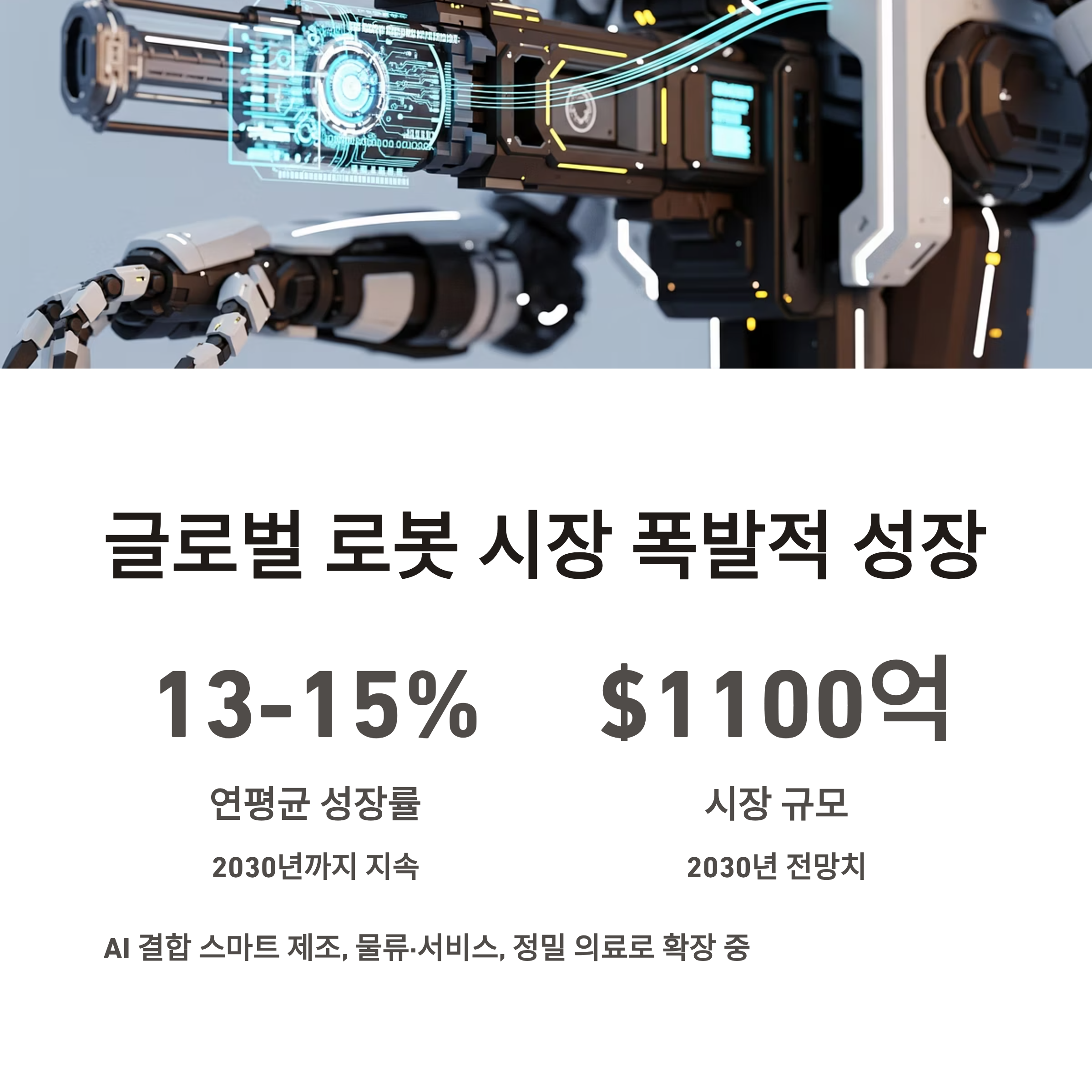 로봇 산업은 이제 단순 제조 자동화를 넘어 AI와 결합한 스마트 제조, 물류·서비스, 정밀 의료 등 전 산업군으로 확장되고 있습니다. 글로벌 시장은 2030년까지 연 13~15% 이상 성장률을 기록하며 약 1100억 달러 규모로 확대될 전망이며, 국내외 상장사 중에서도 관련 모멘텀을 가진 종목에 대한 투자 관심이 집중되고 있습니다.