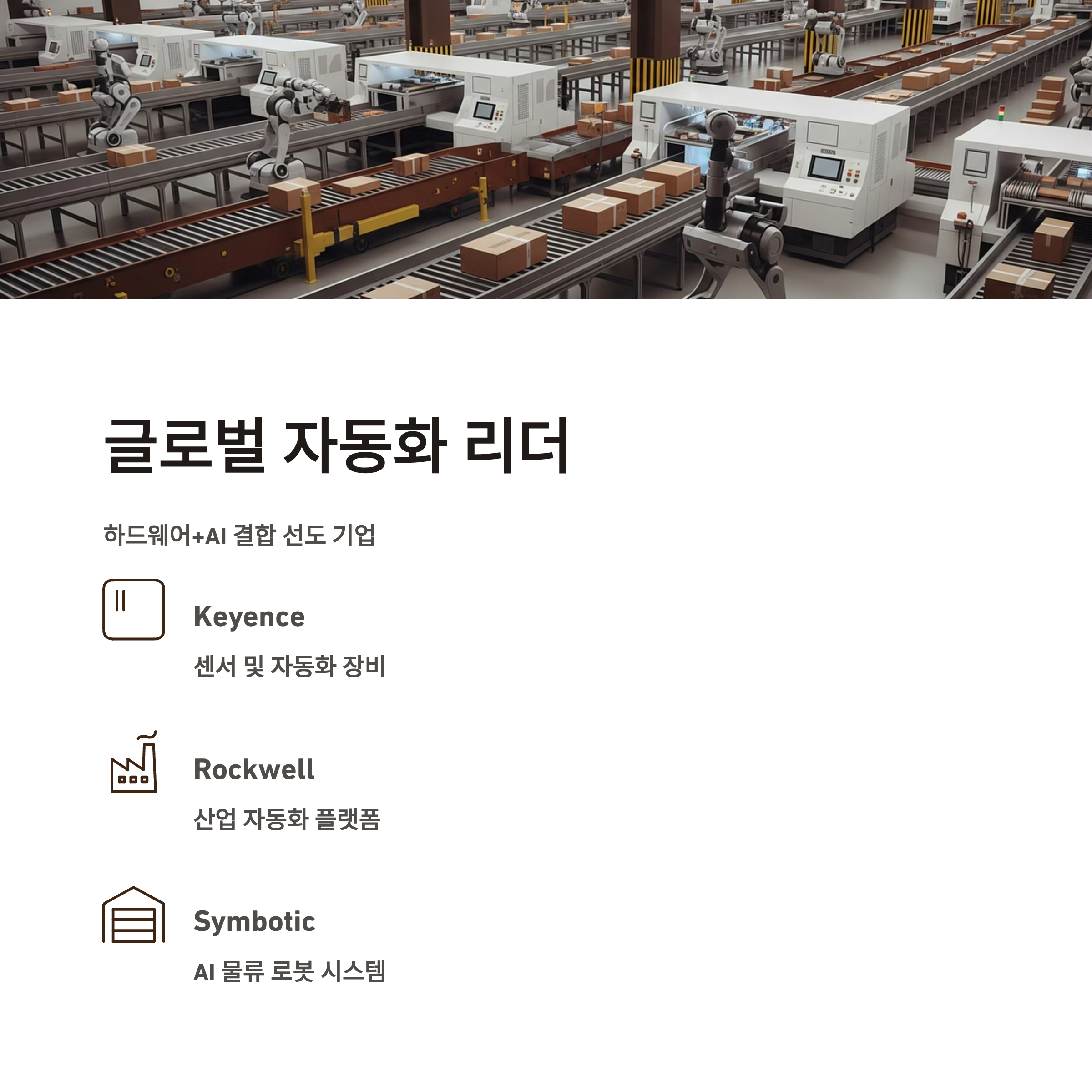 Keyence, Rockwell Automation, Symbotic 등은 자동화 장비, 센서, AI 소프트웨어 플랫폼을 동시에 제공하는 글로벌 자동화 리더입니다.