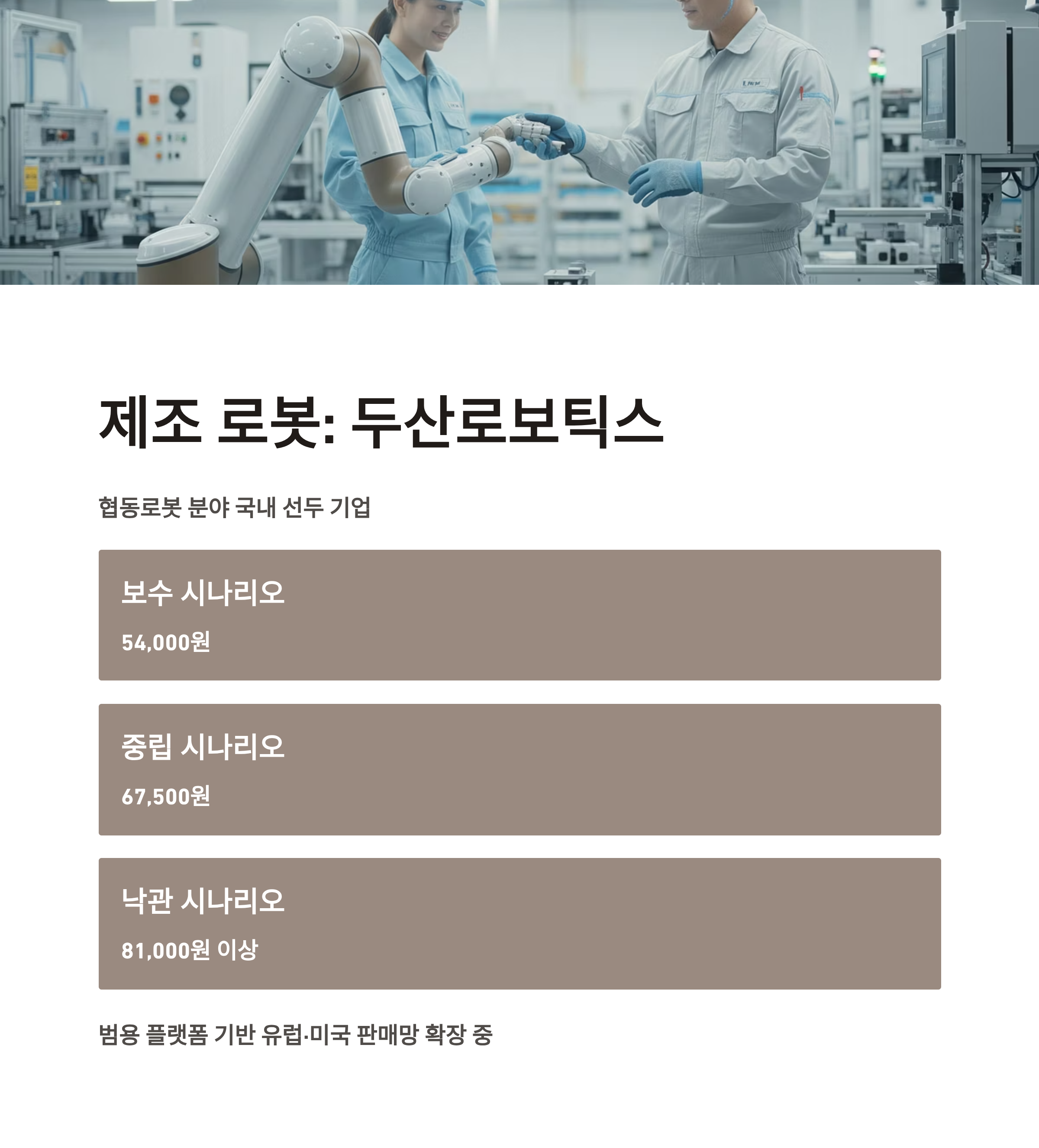 | 제조·협동로봇 | 두산로보틱스 | 국내 대장주, 수출 확대 | 54,000 ~ 81,000원 |
