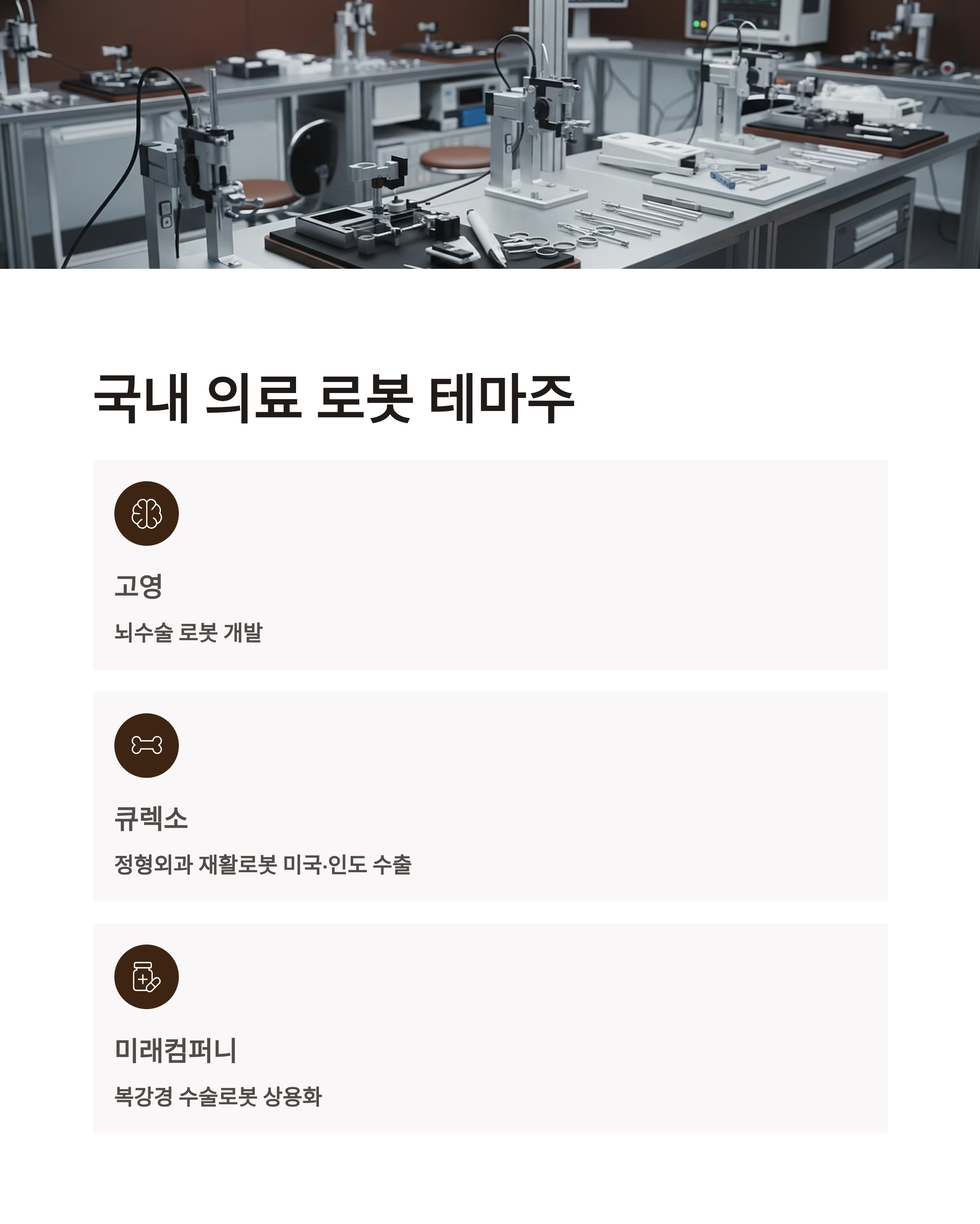 | 의료 로봇 (국내) | 미래컴퍼니, 큐렉소 | 복강경·재활로봇 개발 | 리포트 제한, 테마 분석 필요 |