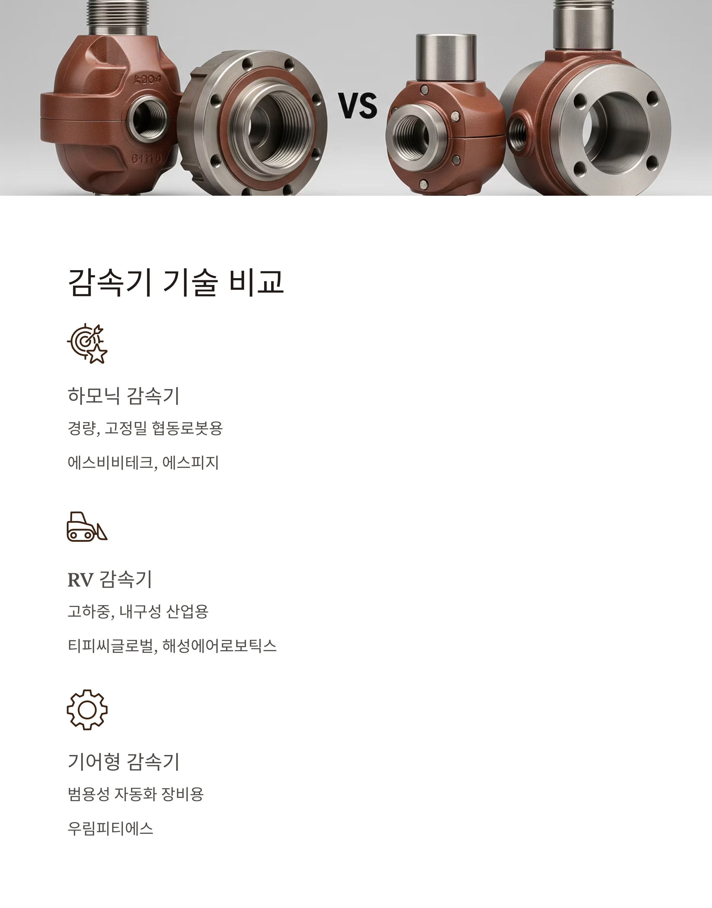 | 싸이클로이드(RV) 감속기 | 고하중, 내구성 강점 | 산업용 로봇 하부 관절 | 티피씨글로벌, 해성에어로보틱스 |