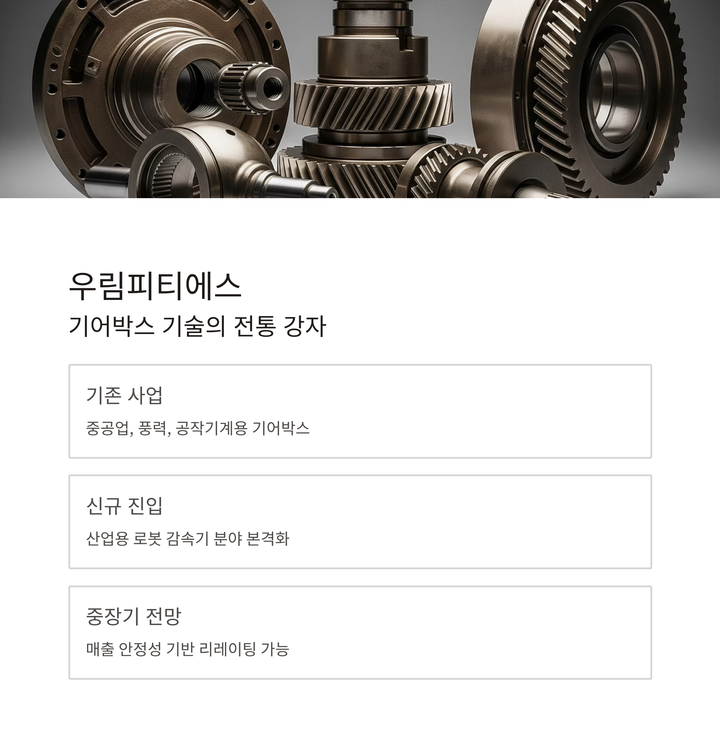 우림피티에스는 기존 중공업, 풍력, 공작기계용 기어박스 사업을 운영해 온 기업으로, 최근 산업용 로봇 감속기 분야 진입을 본격화했습니다. 직접적인 로봇 테마의 강도는 다소 약할 수 있지만, 감속기 생산 경험과 고정밀 부품 가공 기술이 있어 기술적 확장성은 충분히 평가받을 수 있습니다.