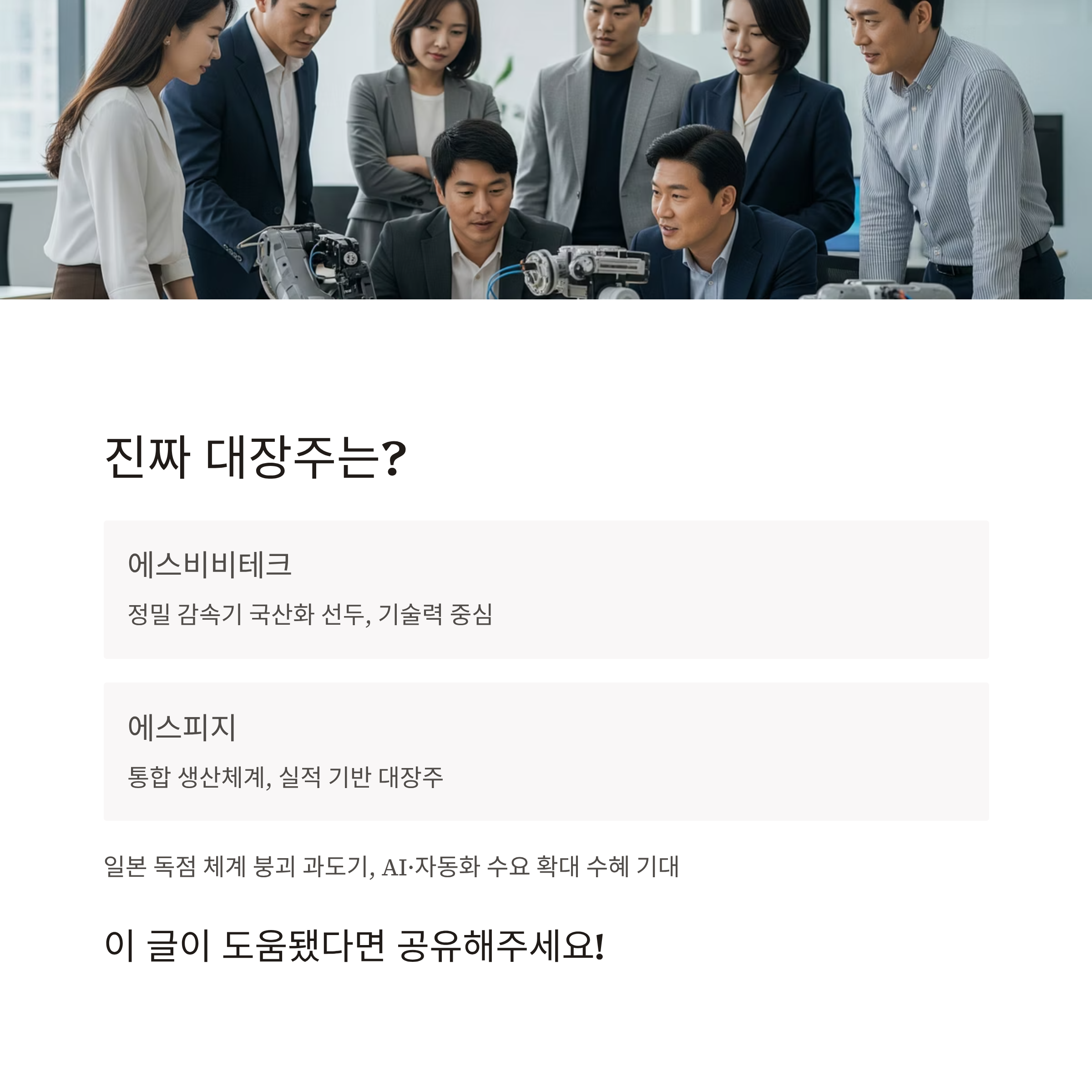 이 가운데 에스비비테크는 정밀 감속기 국산화의 선두주자로 기술력 중심의 대장주로, 에스피지는 감속기+모터 통합 생산체계를 통한 실적 기반 대장주로 평가받고 있습니다.