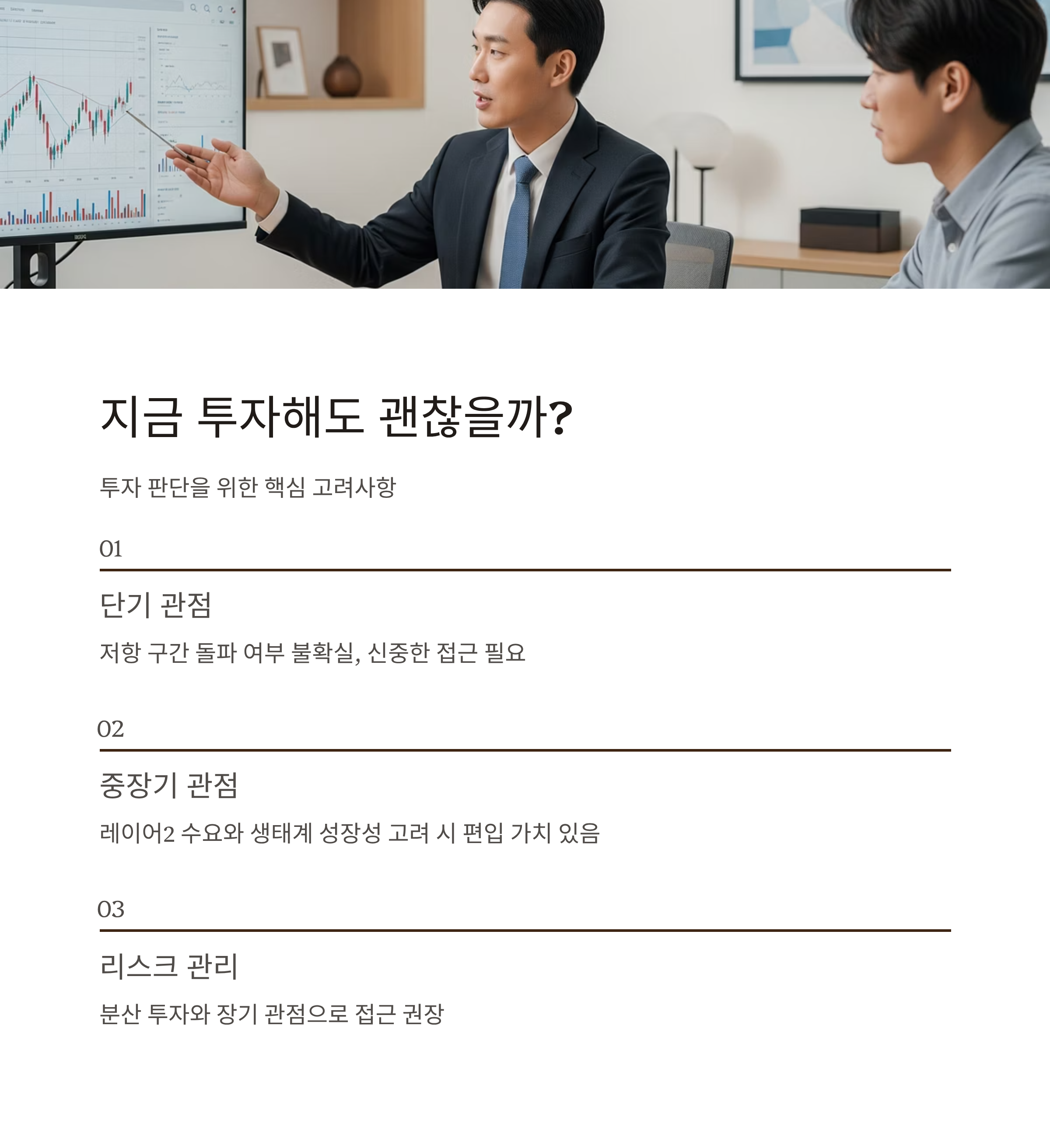 다만 투자 금액은 분산하고, 장기 관점으로 바라보는 것이 리스크 관리에 유리합니다.