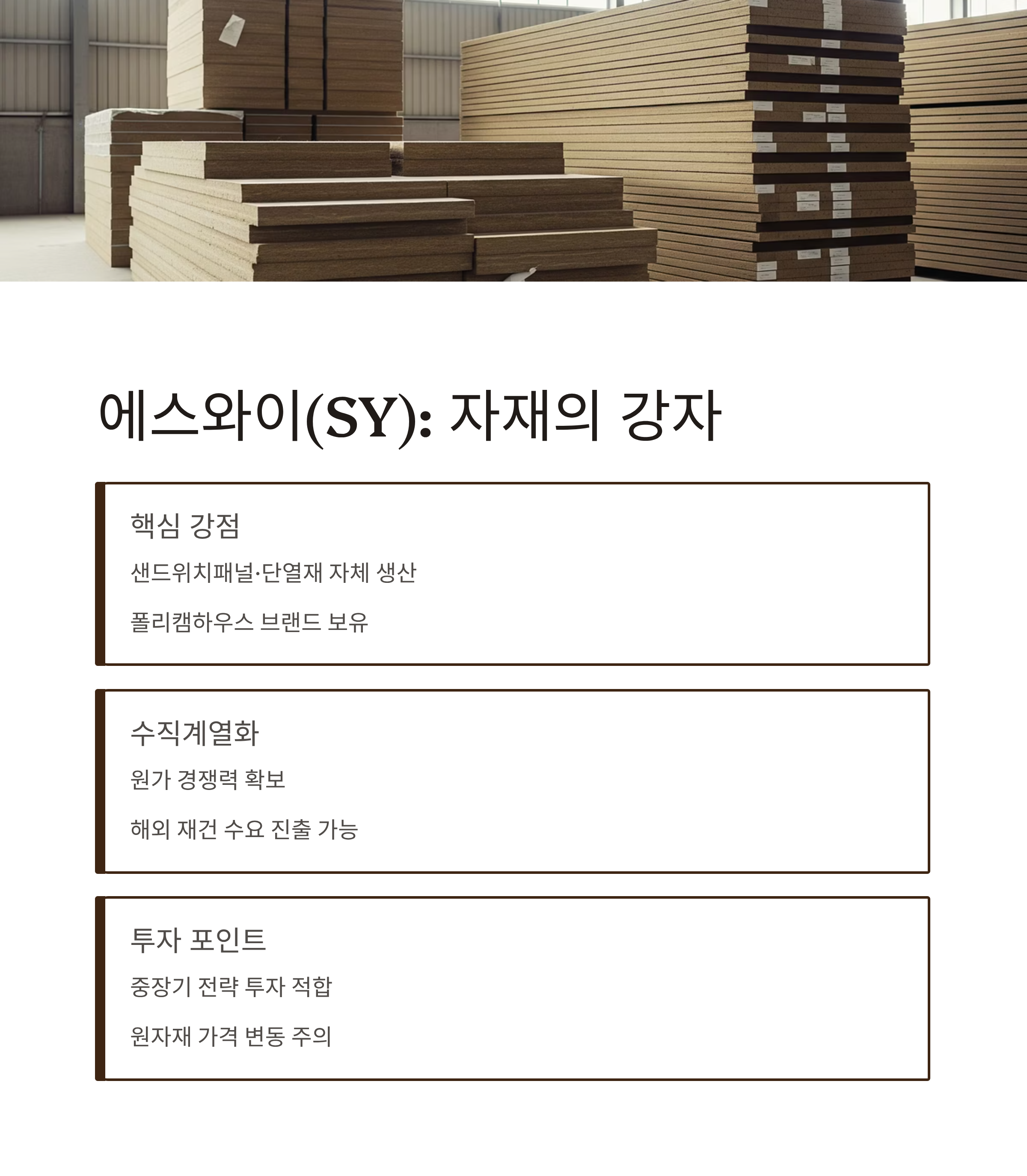 에스와이는 샌드위치패널, 단열재, 데크플레이트 등 조립식 건축자재 전문 기업입니다. 자회사 SY빌드를 통해 '폴리캠하우스'라는 자체 모듈러 주택 브랜드를 보유하고 있으며, 공업화주택 승인까지 획득한 이력이 있습니다.