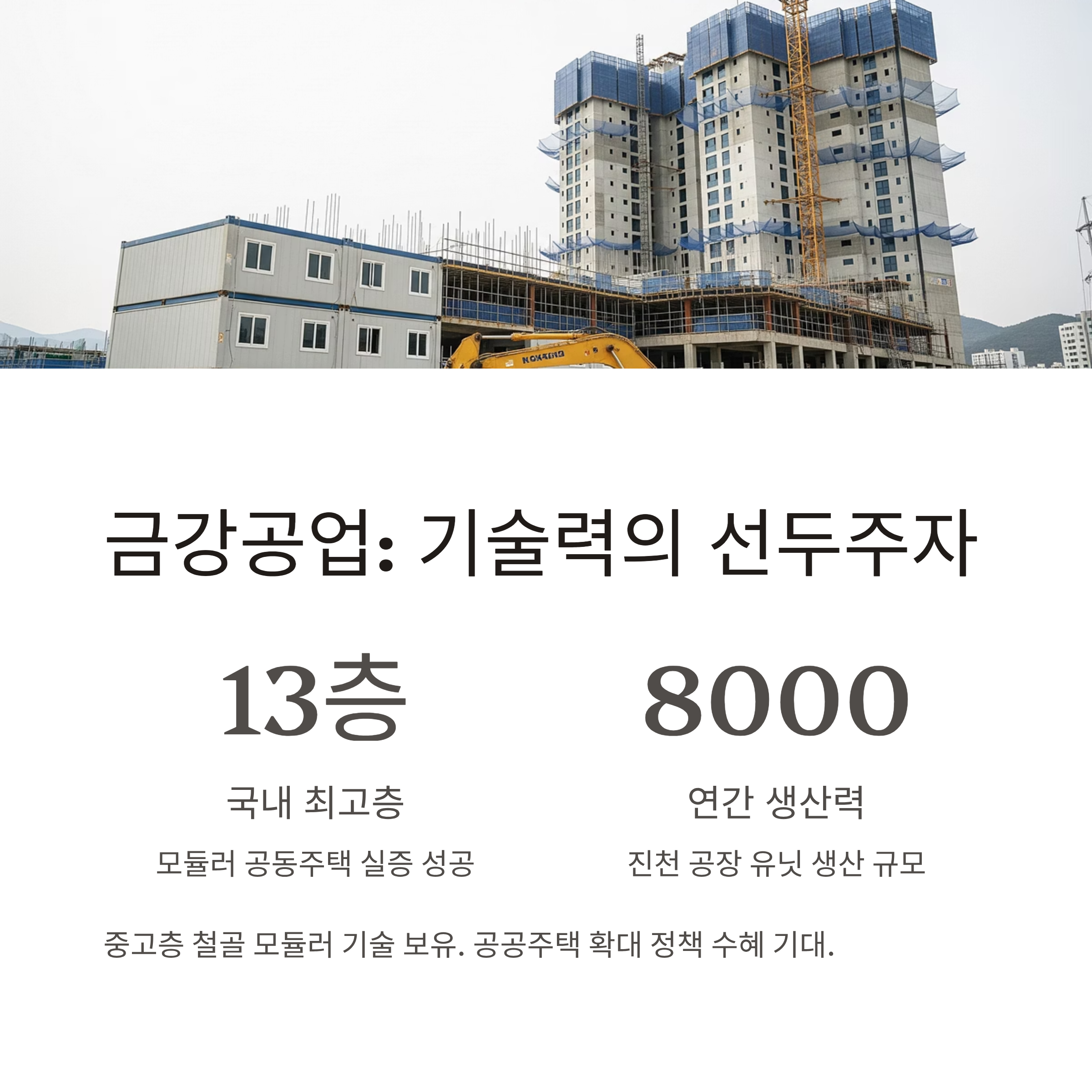 금강공업은 강관, 폼웍, 알루미늄 폼 등 건축구조 자재에서 오랜 업력을 자랑하는 기업입니다. 모듈러 주택 관련해서는 13층 규모의 국내 최고층 모듈러 공동주택 실증에 성공하며 기술력을 입증했습니다.