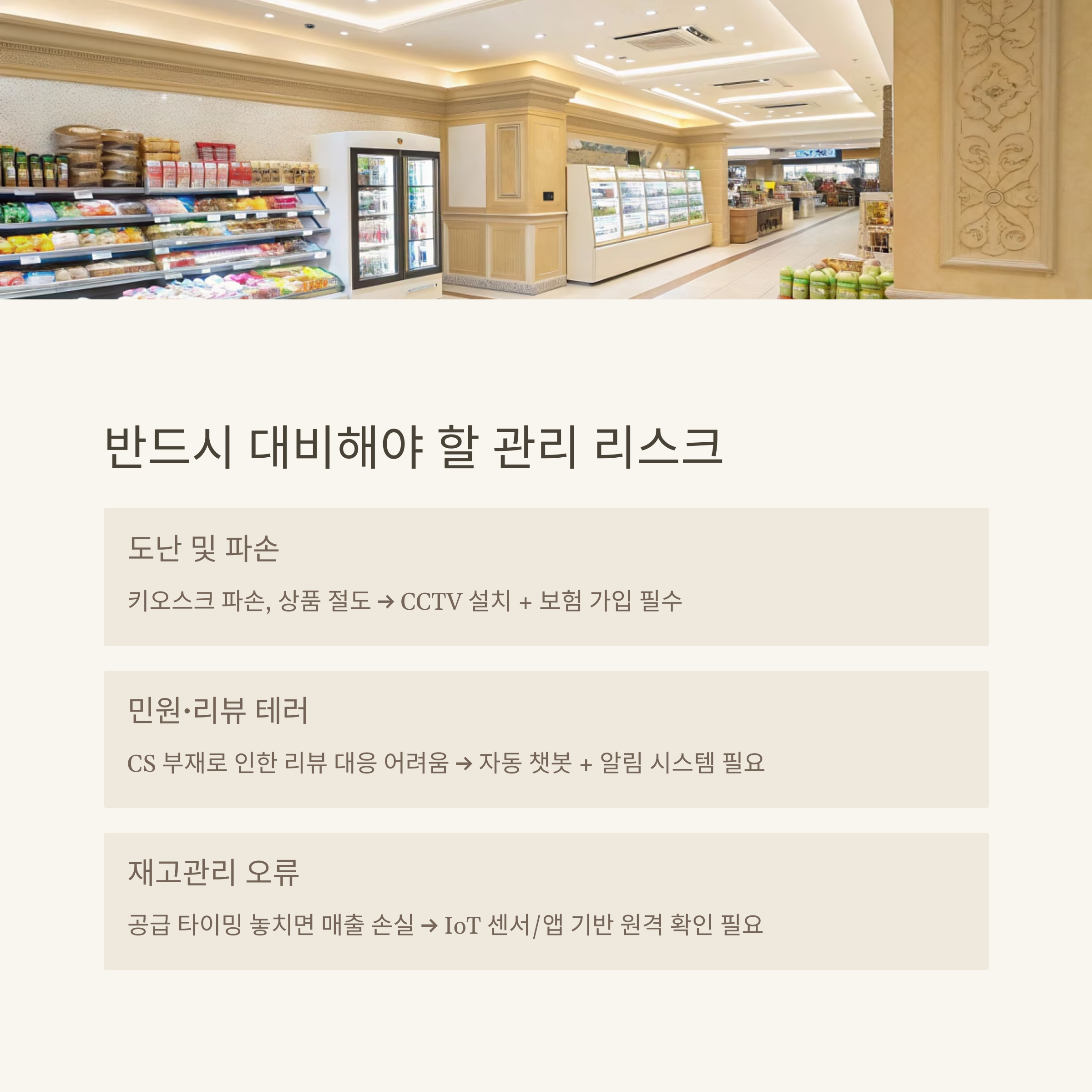 → 무인 매장은 수익 구조는 안정적이나, 리스크 관리 능력이 수익을 결정함
