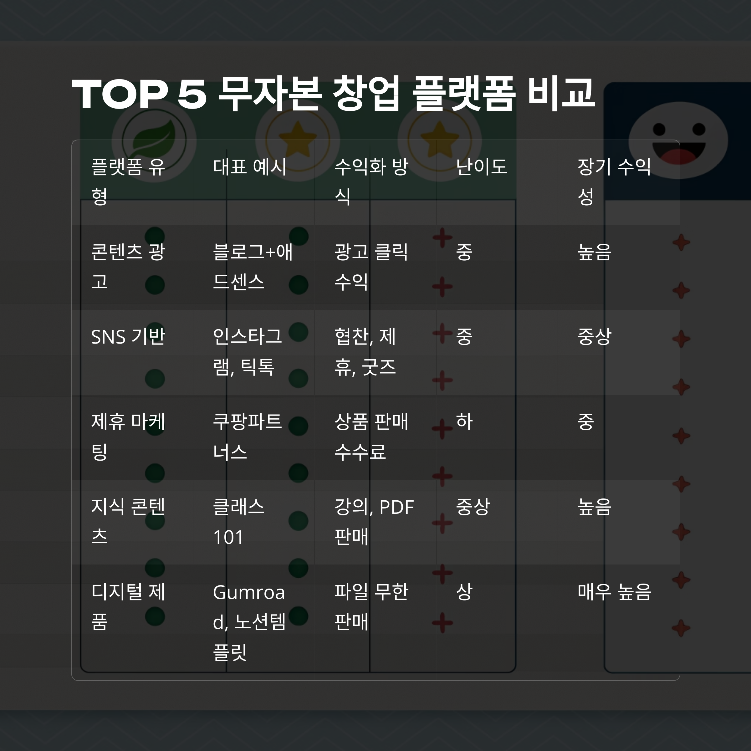 이 글에서는 가장 인기 있고 실질적인 수익 창출이 가능한 5가지 무자본 창업 플랫폼을 비교 분석해드립니다.