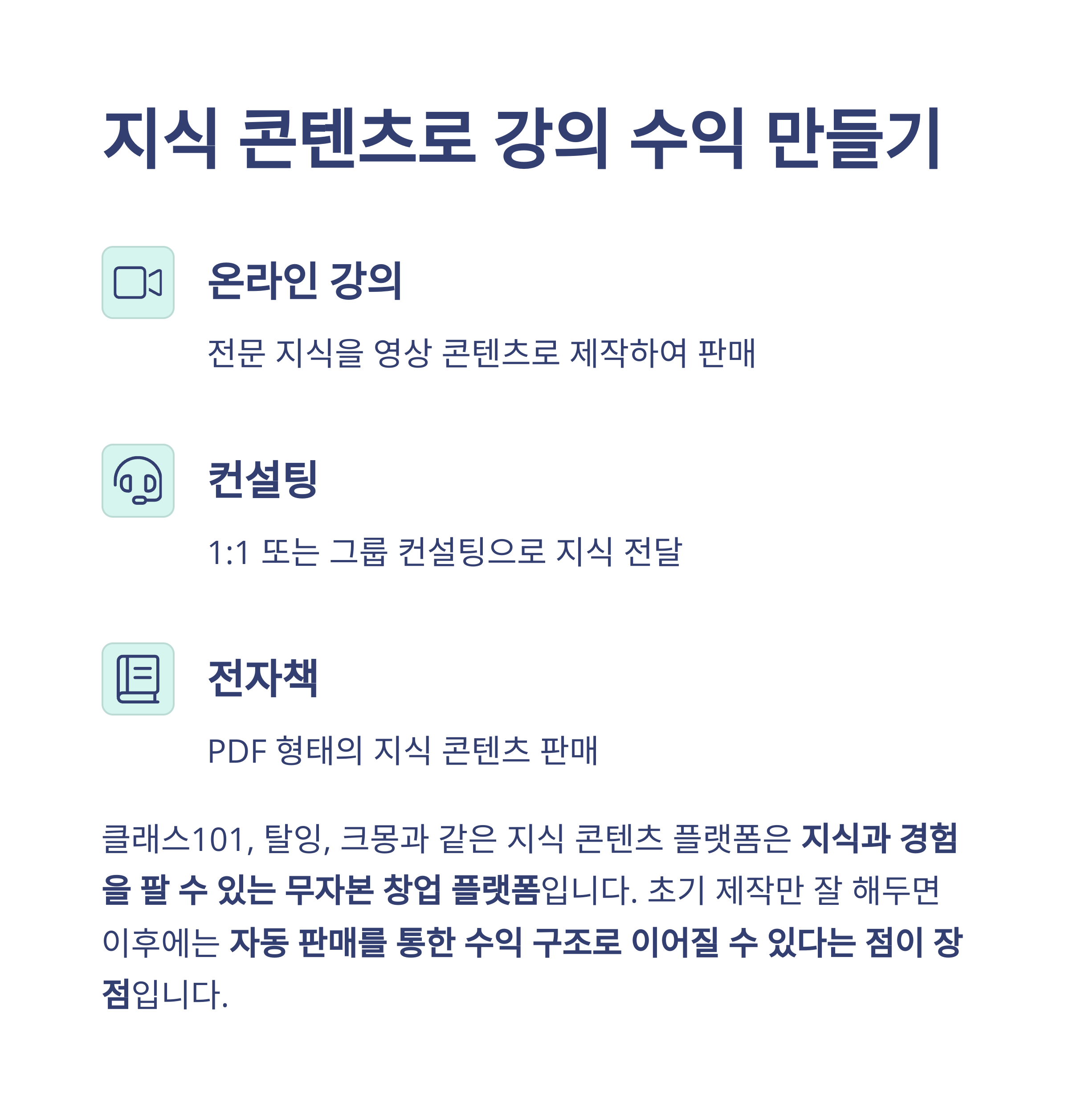 | 지식 콘텐츠 | 클래스101 | 강의, PDF 판매 | 중상 | 높음 |