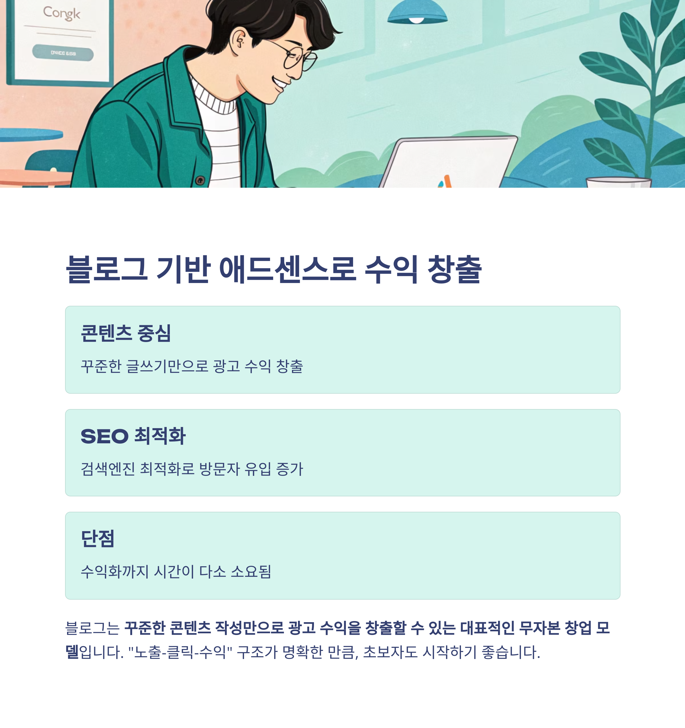 블로그는 꾸준한 콘텐츠 작성만으로 광고 수익을 창출할 수 있는 대표적인 무자본 창업 모델입니다.