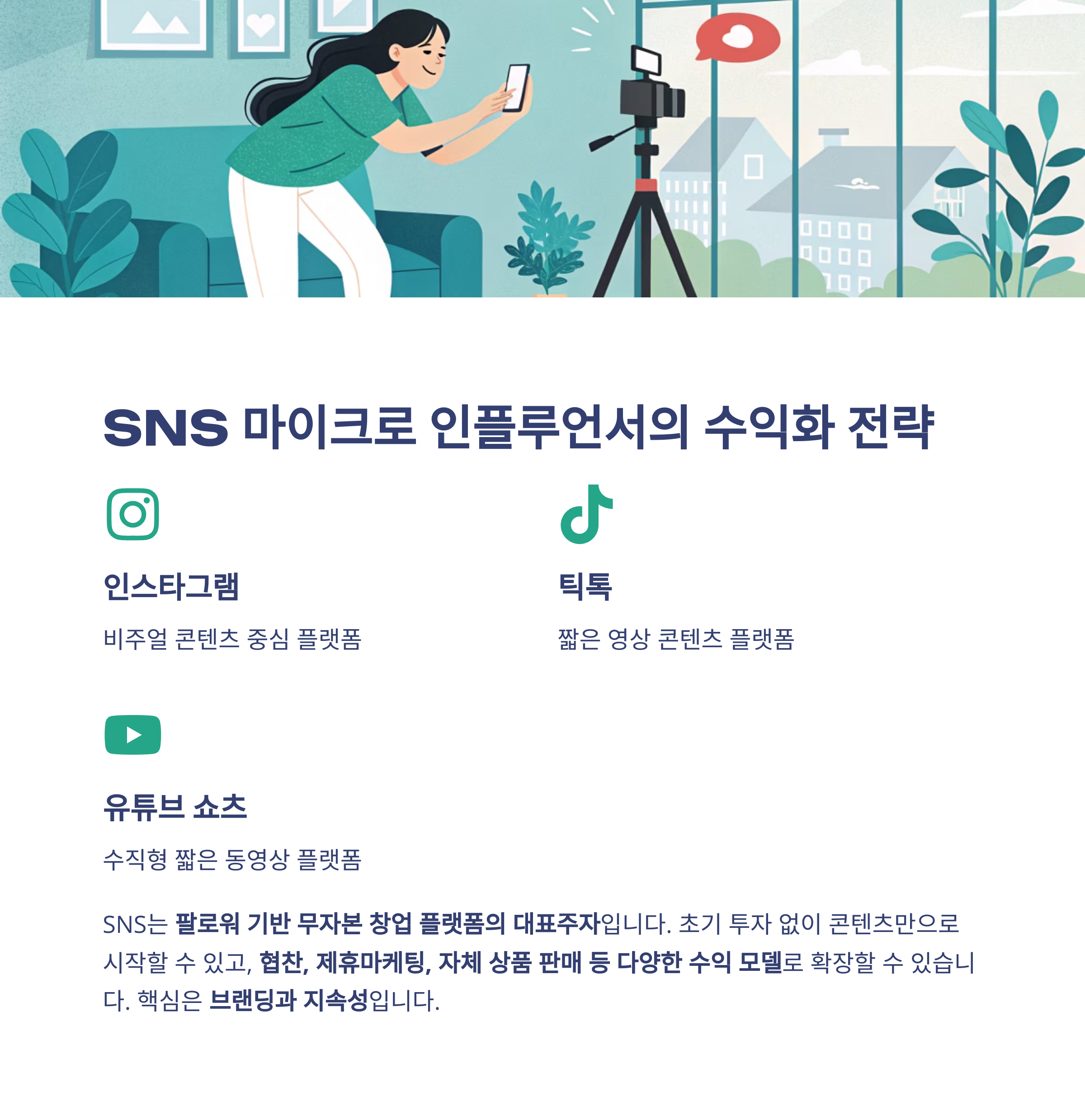 인스타그램, 틱톡, 유튜브 쇼츠 등 SNS는 팔로워 기반 무자본 창업 플랫폼의 대표주자입니다.