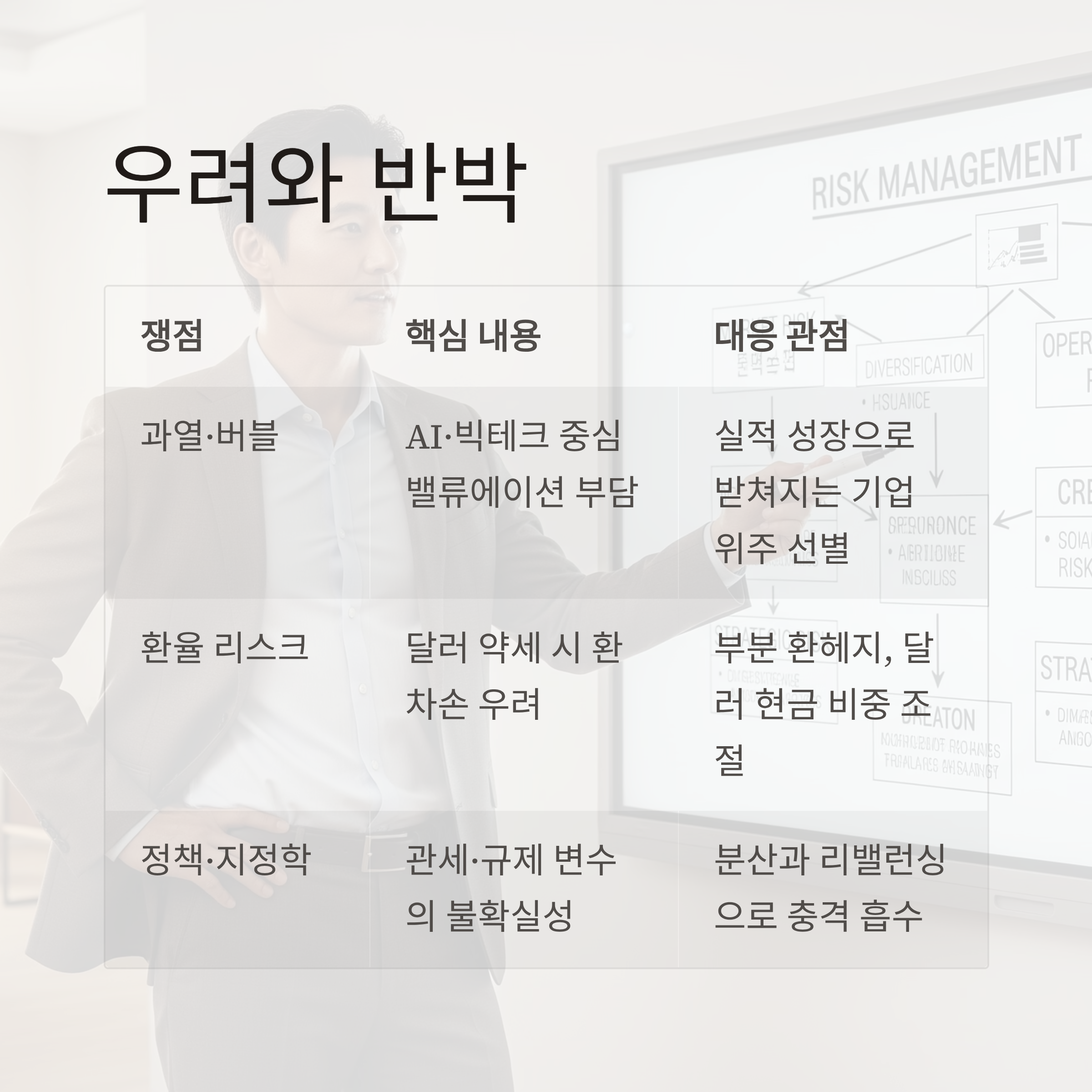 | 정책·지정학 | 관세·규제 변수의 불확실성 | 이미 일부 선반영. 업종·기업별 체력 차이로 실적 분화. 분산과 리밸런싱으로 충격 흡수 |