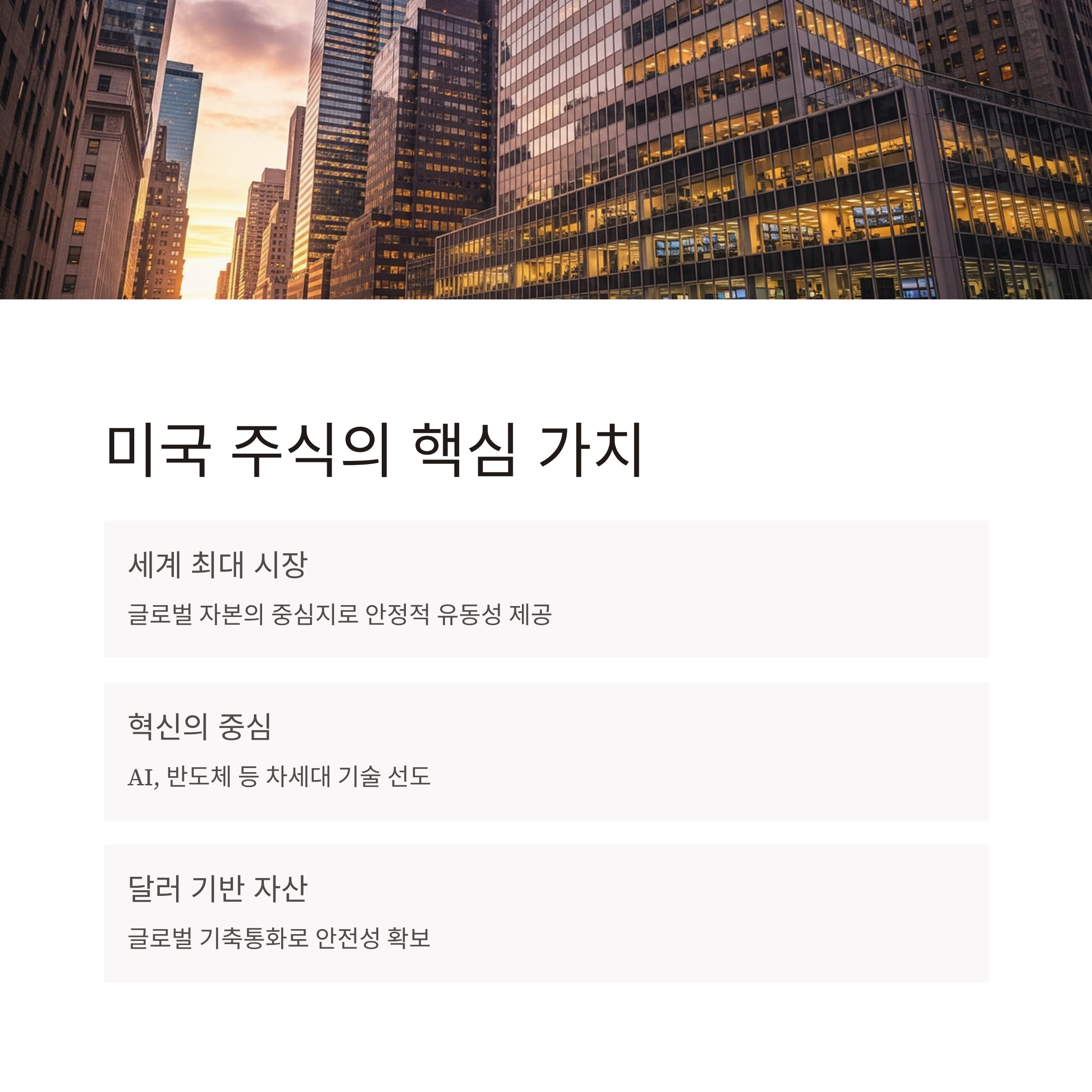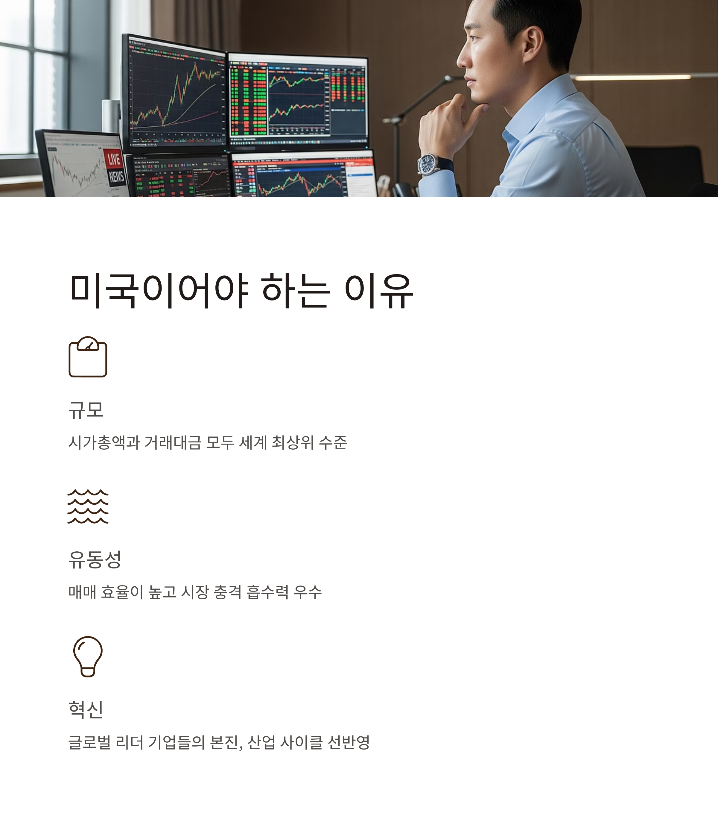미국 증시는 시가총액과 거래대금 모두 세계 최상위입니다. 사고팔기가 쉬워 매매 효율이 높고, 시장 충격 흡수력도 우수합니다. 여기에 글로벌 리더 기업들이 본진을 두고 있어 산업 사이클의 과실을 가장 먼저, 가장 크게 반영합니다. 제도·공시·감독 체계가 정교하다는 점도 장기 투자자에게 신뢰를 제공합니다. 결국 투자자는 “좋은 기업을 좋은 시장에서 오래 들고 가는” 간결한 원칙을 실천하기 용이합니다.