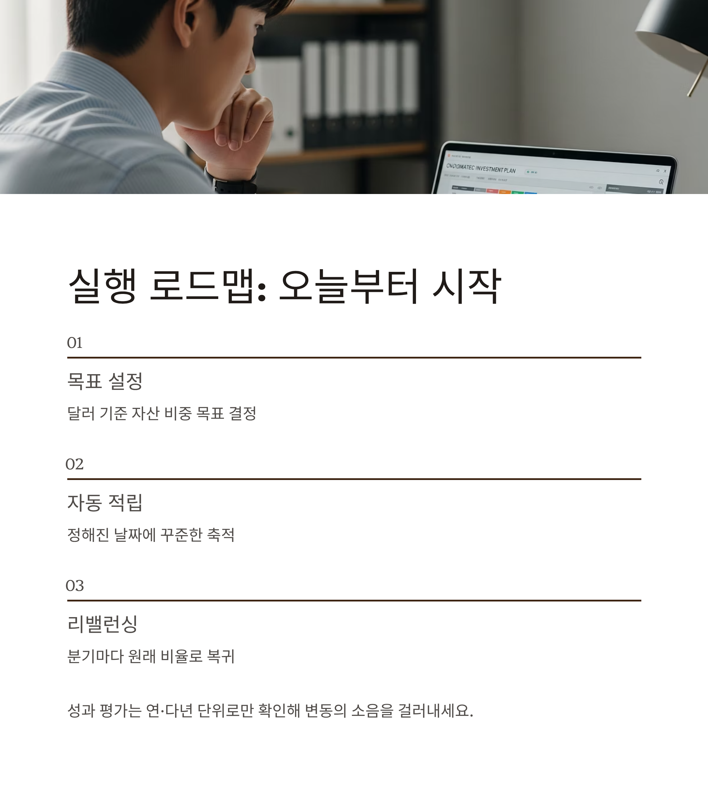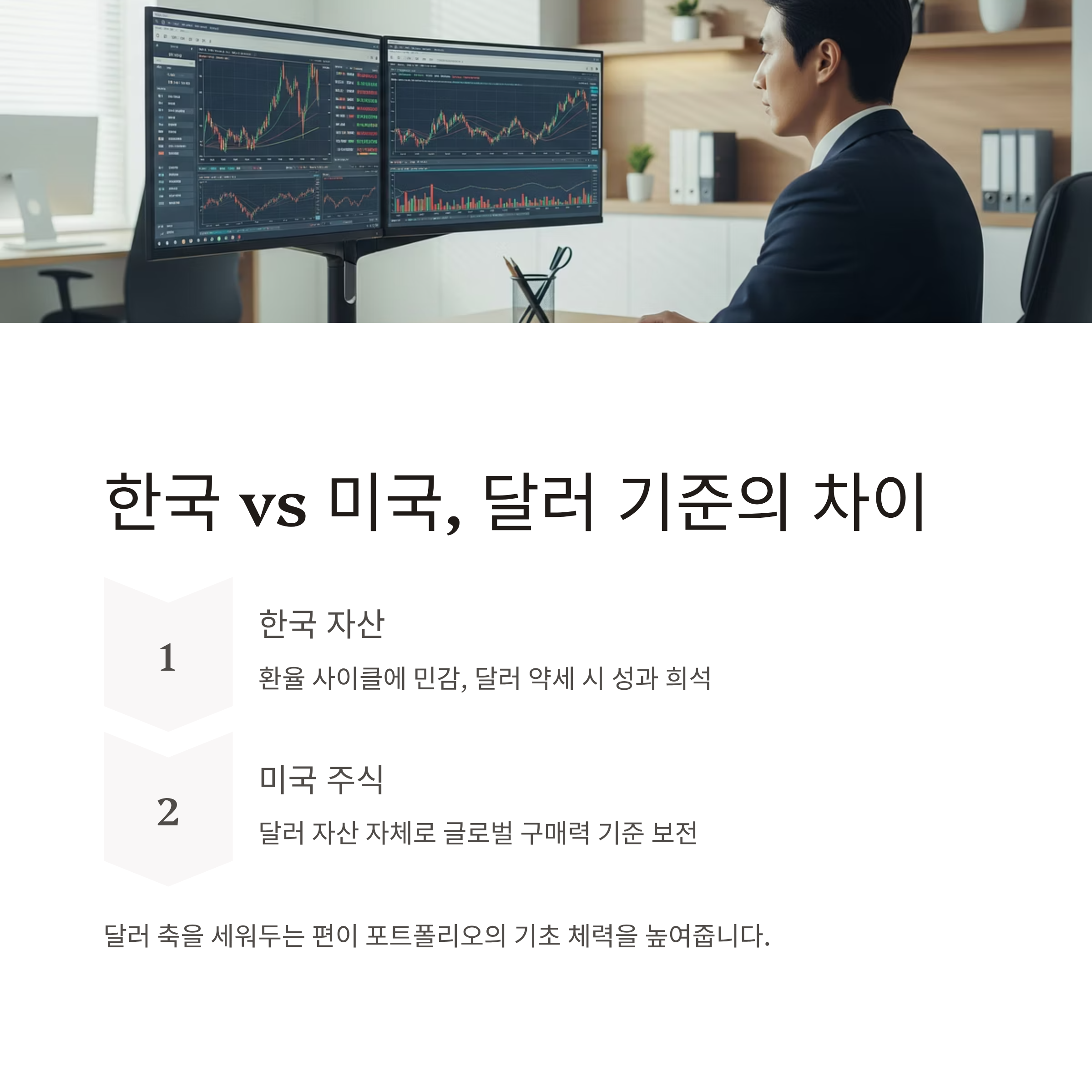 처음부터 완벽할 필요는 없습니다. 달러 기준 자산 비중 목표를 정하고, 정해진 날짜에 자동 적립으로 축적하며, 분기마다 리밸런싱으로 원래 비율을 복귀하는 루틴이면 충분합니다. 성과 평가는 월 단위가 아닌 연·다년 단위로만 확인해 “변동의 소음”을 걸러내세요. 시간이 지날수록 복리의 곡선이 부드럽게 올라타기 시작합니다.