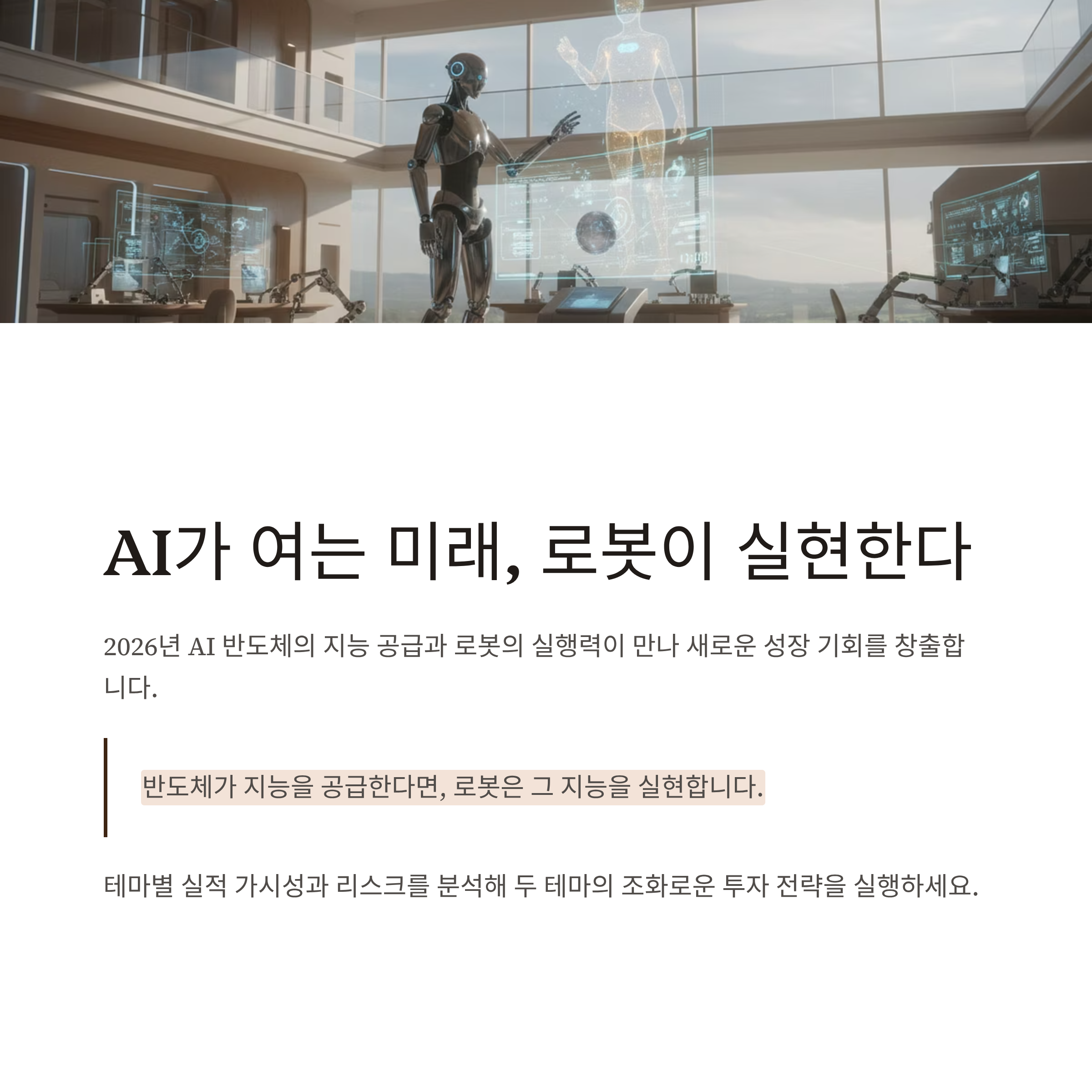 2026년에는 AI가 실제 현장을 바꾸는 실행력이 더해지면서, 로봇 관련주의 상승 여력이 더 커질 수 있습니다. 다만, 테마별 실적 가시성과 리스크 요인을 명확히 분석해 투자하는 것이 핵심입니다.