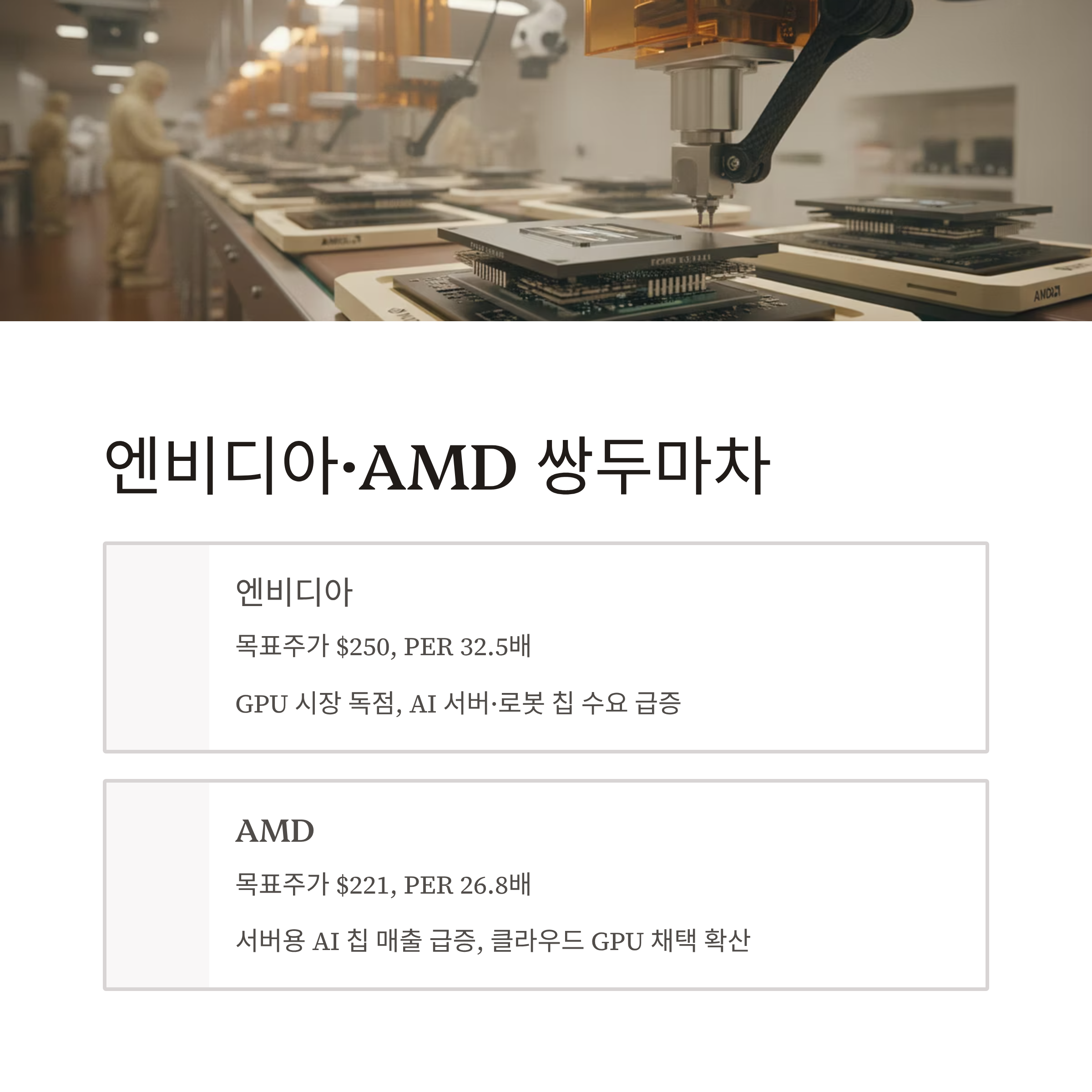 | AMD | $221 (Goldman Sachs) | 26.8배 | 클라우드 GPU 채택 확산 |