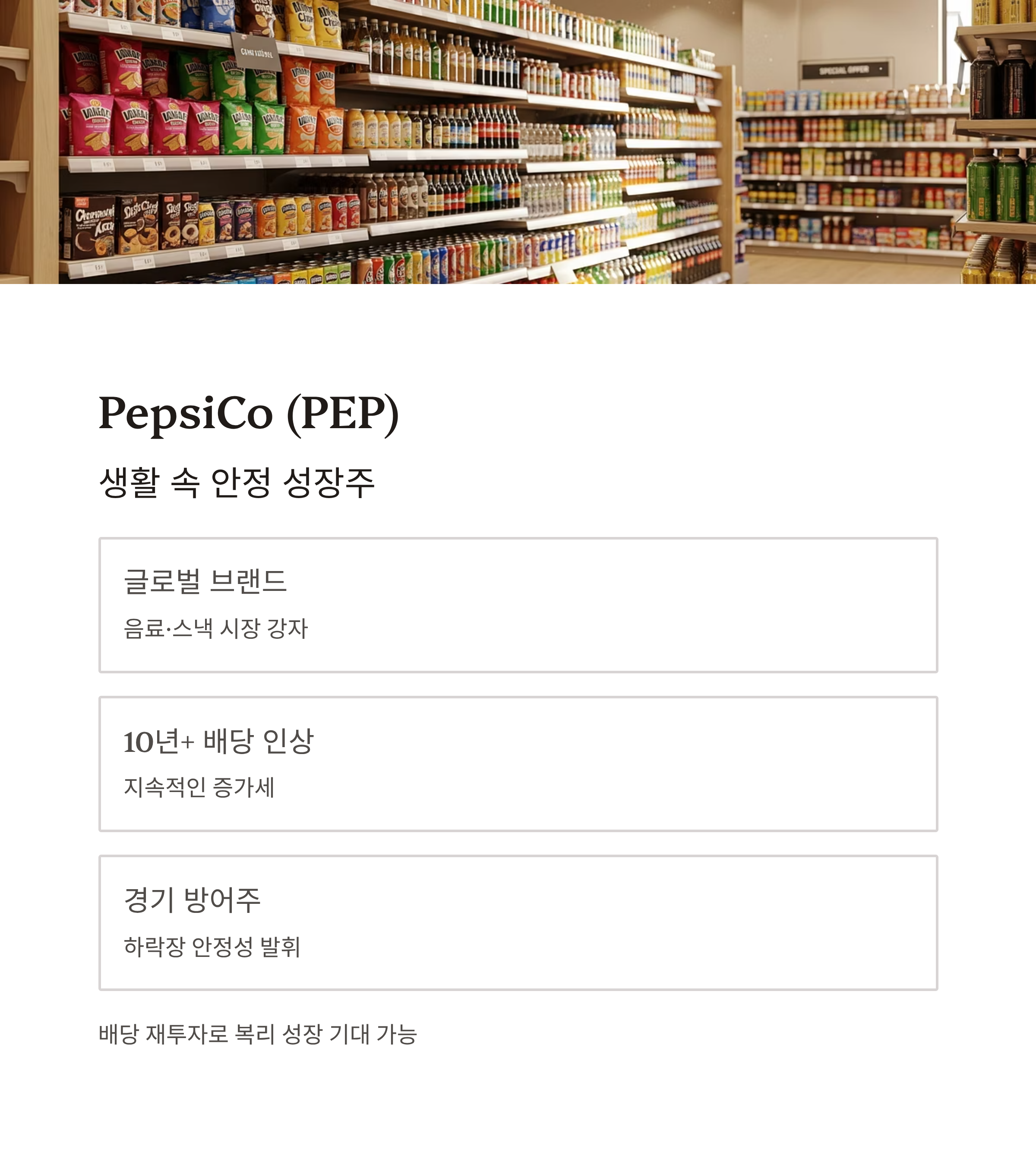 PepsiCo (PEP) | 소비재 | 약 2.9% | 글로벌 브랜드 + 경기 방어 | 성장성 제한 / 원가 부담 |
