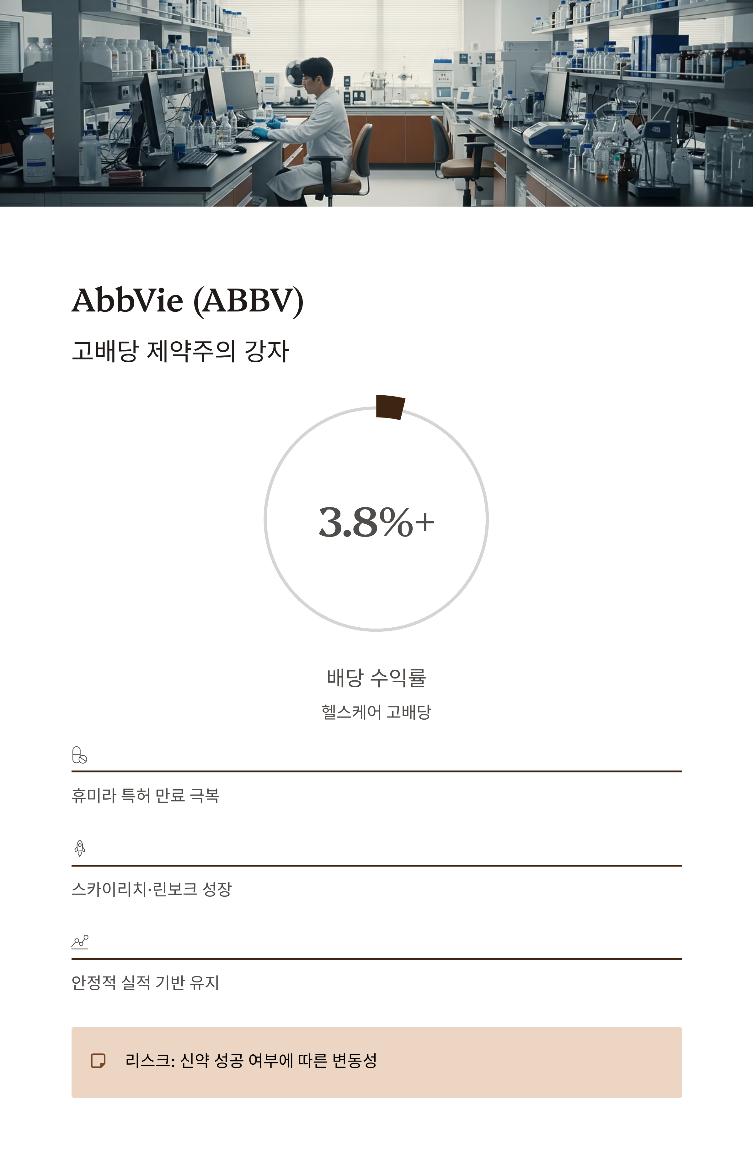 AbbVie (ABBV) | 제약 | 약 3.8% | 고배당 + 신약 파이프라인 성장성 | 주가 변동성 / 신약 성공 여부 |