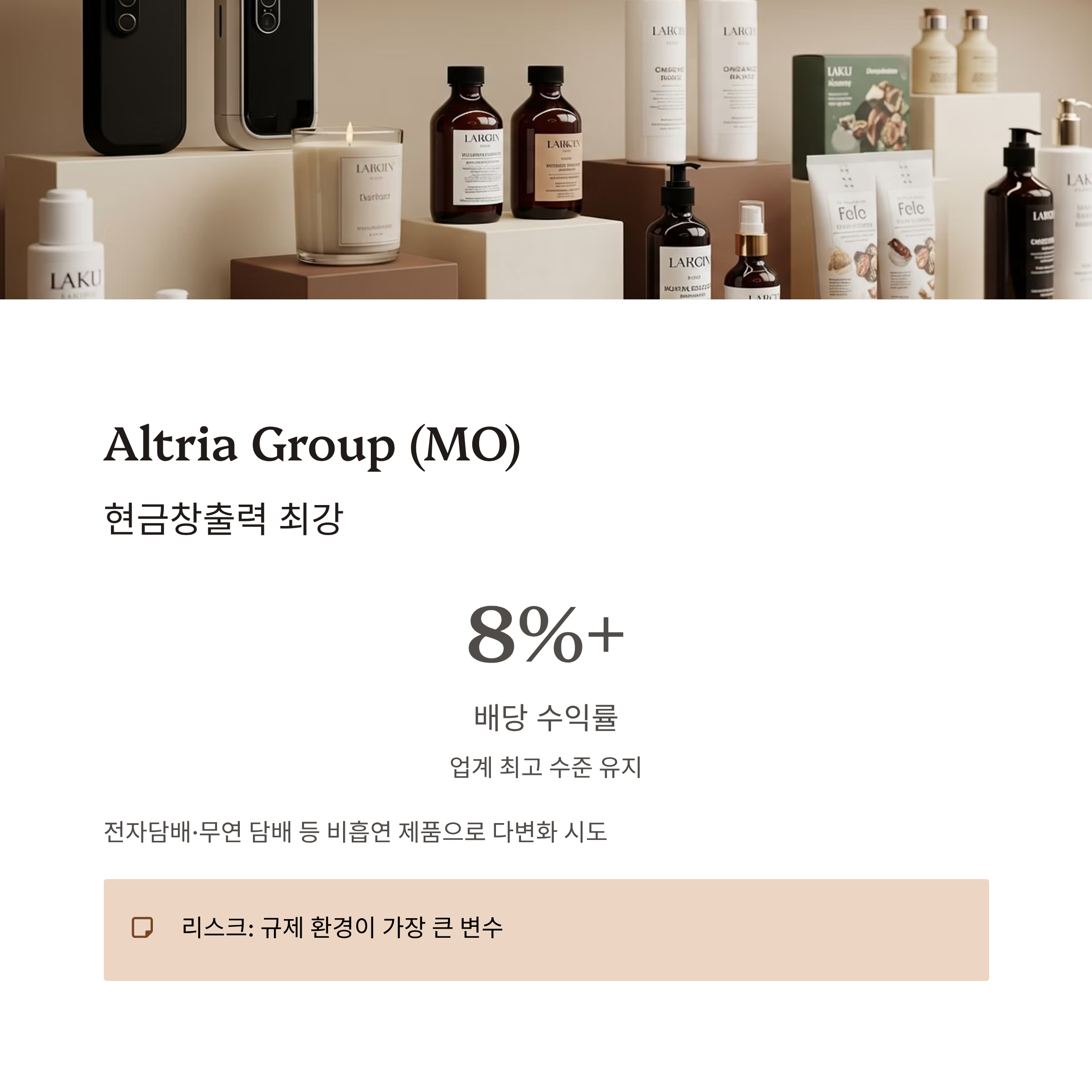 Altria (MO) | 소비재(담배) | 약 8.0% | 고배당 유지 / 안정적인 캐시플로우 | 규제 리스크 / 소비 트렌드 변화 |