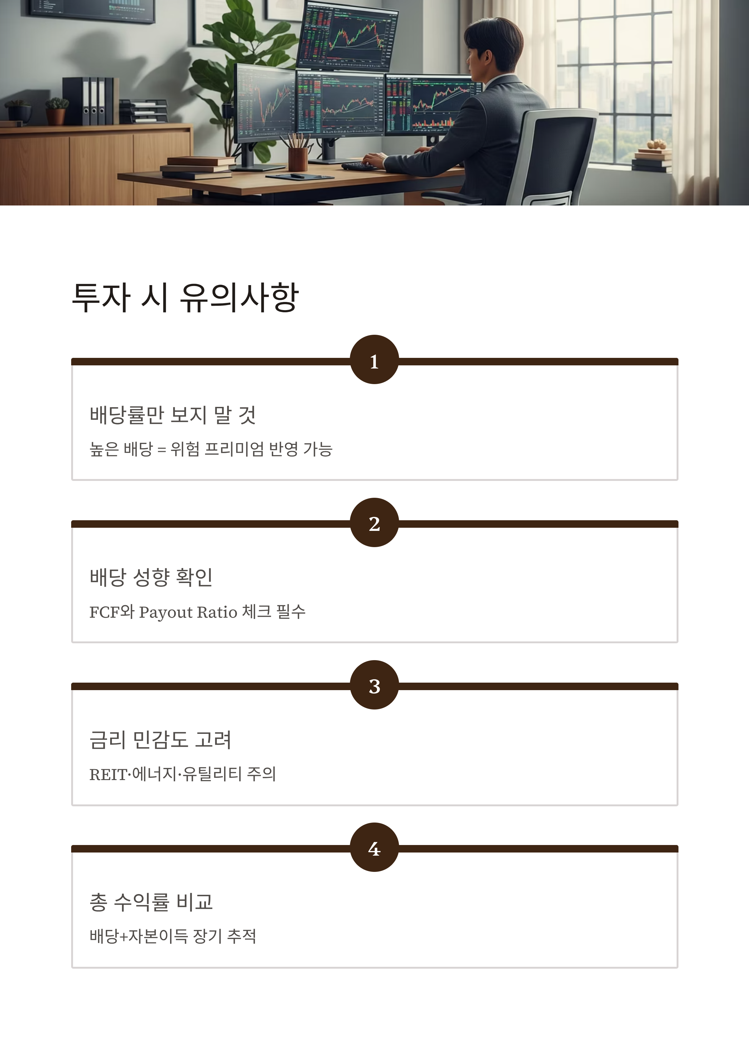 - 배당 성향(Payout Ratio)과 FCF(잉여현금흐름)를 같이 확인해야 함