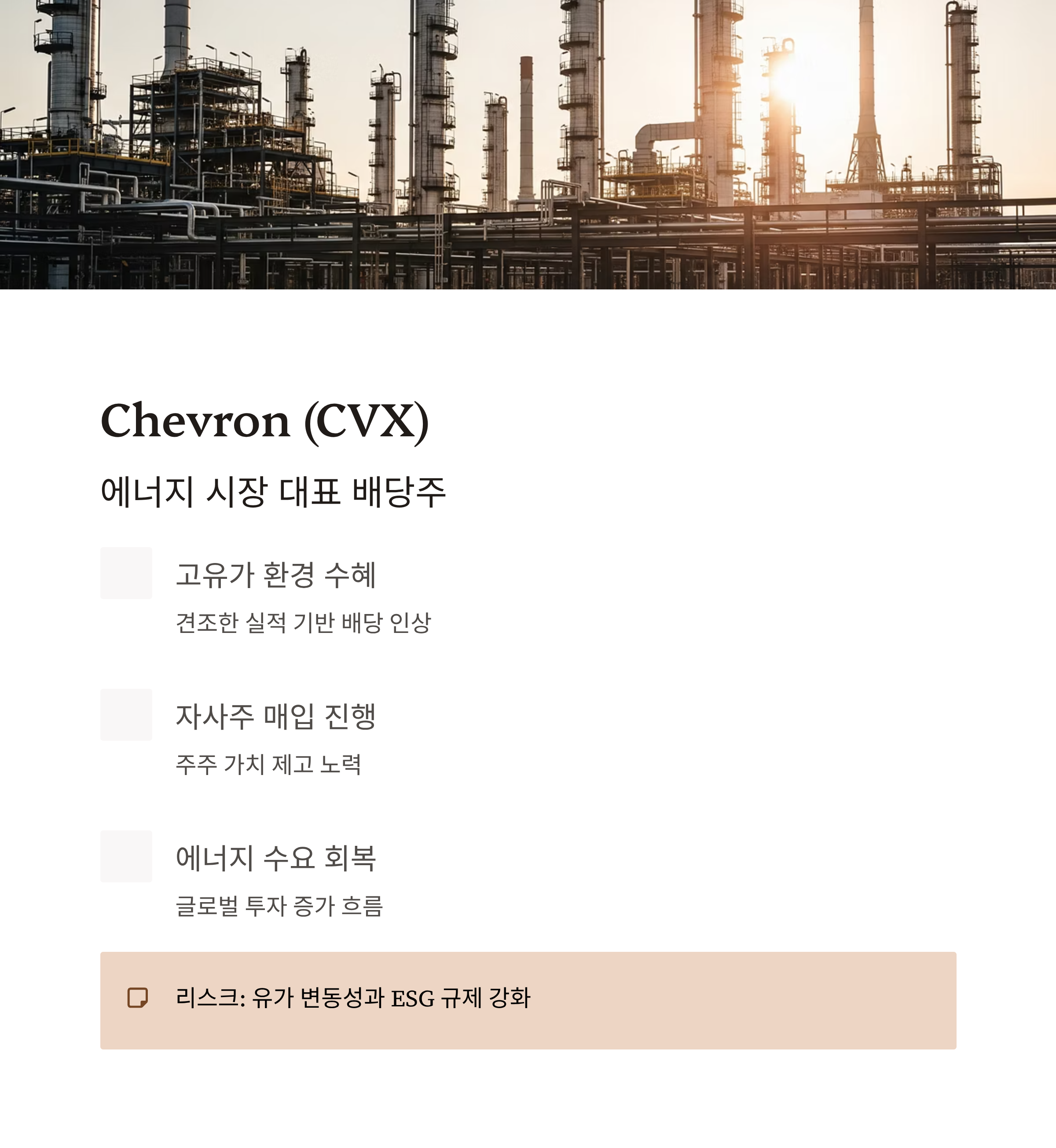 Chevron (CVX) | 에너지 | 약 4.4% | 유가 상승 기대감 / 자사주 매입 확대 | 유가 변동성 / 환경 규제 |