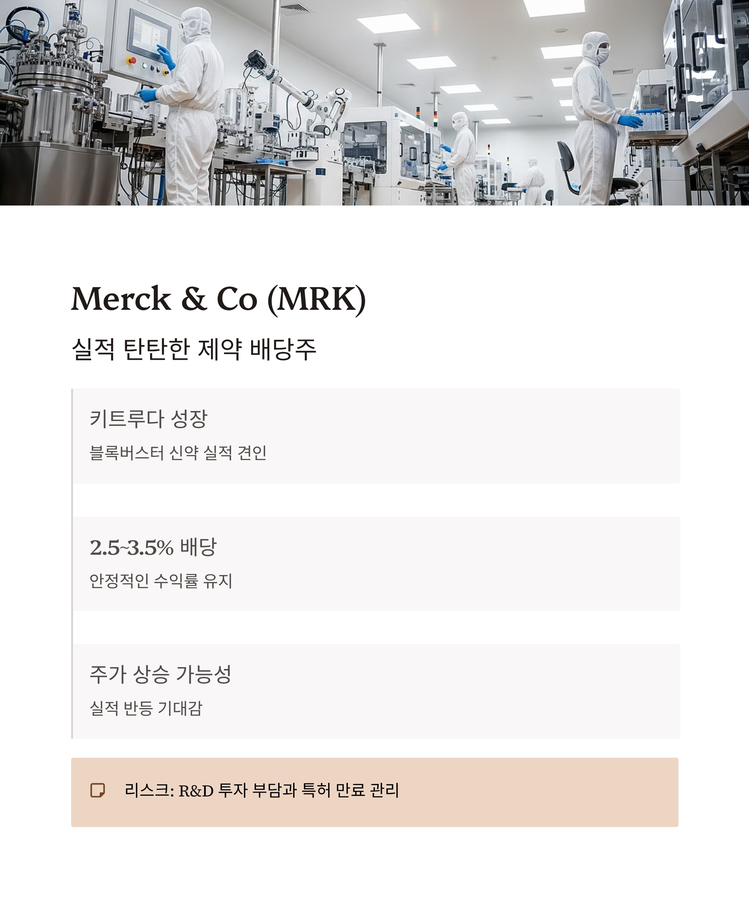 | Merck (MRK) | 제약 | 약 3.2% | 신약 성장 + 배당 안정성 | R&D 투자 부담 / 특허 만료 |