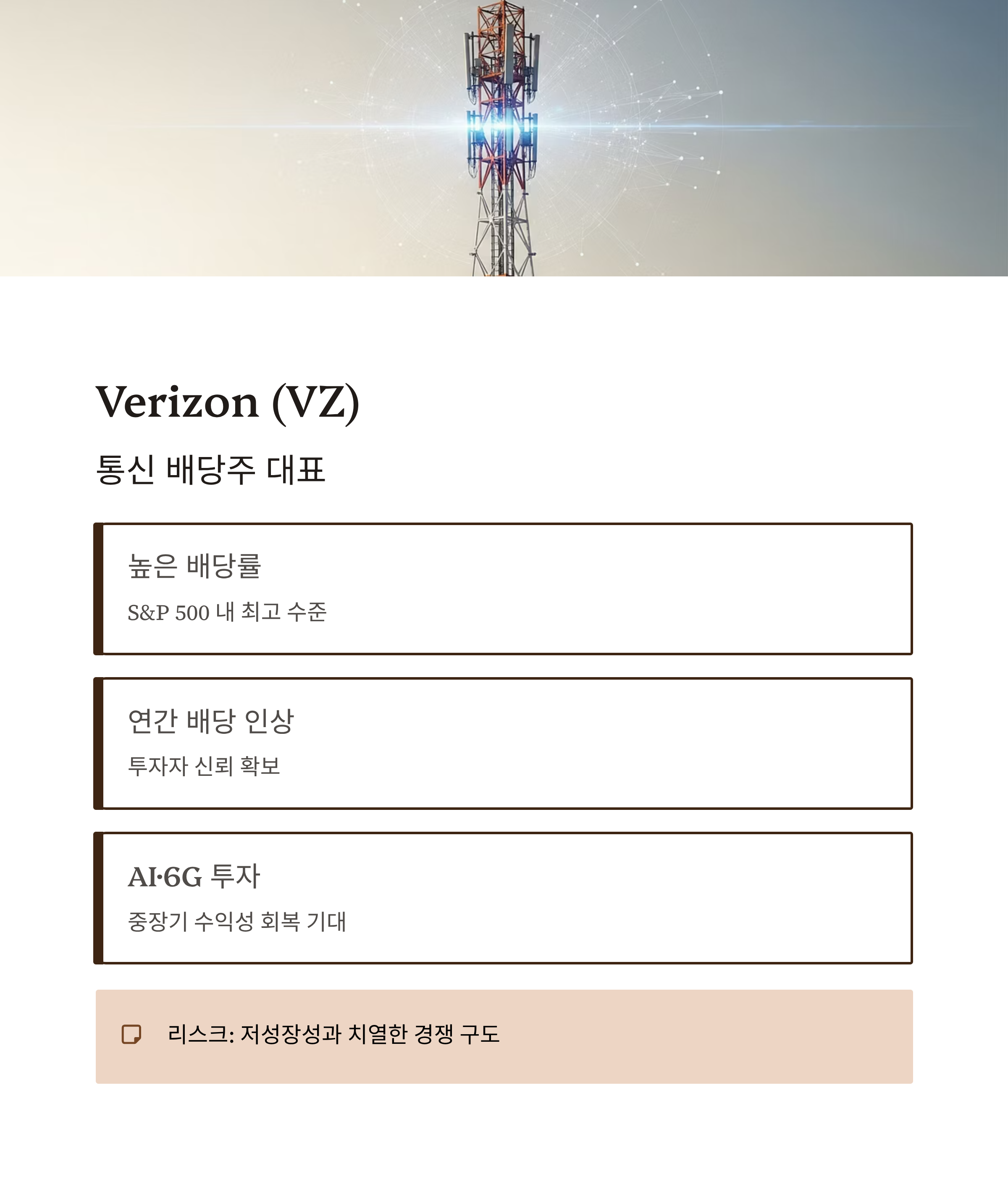 Verizon (VZ) | 통신 | 약 6.5% | 안정적인 현금 흐름 + 배당 인상 | 성장 둔화 / 경쟁 심화 |