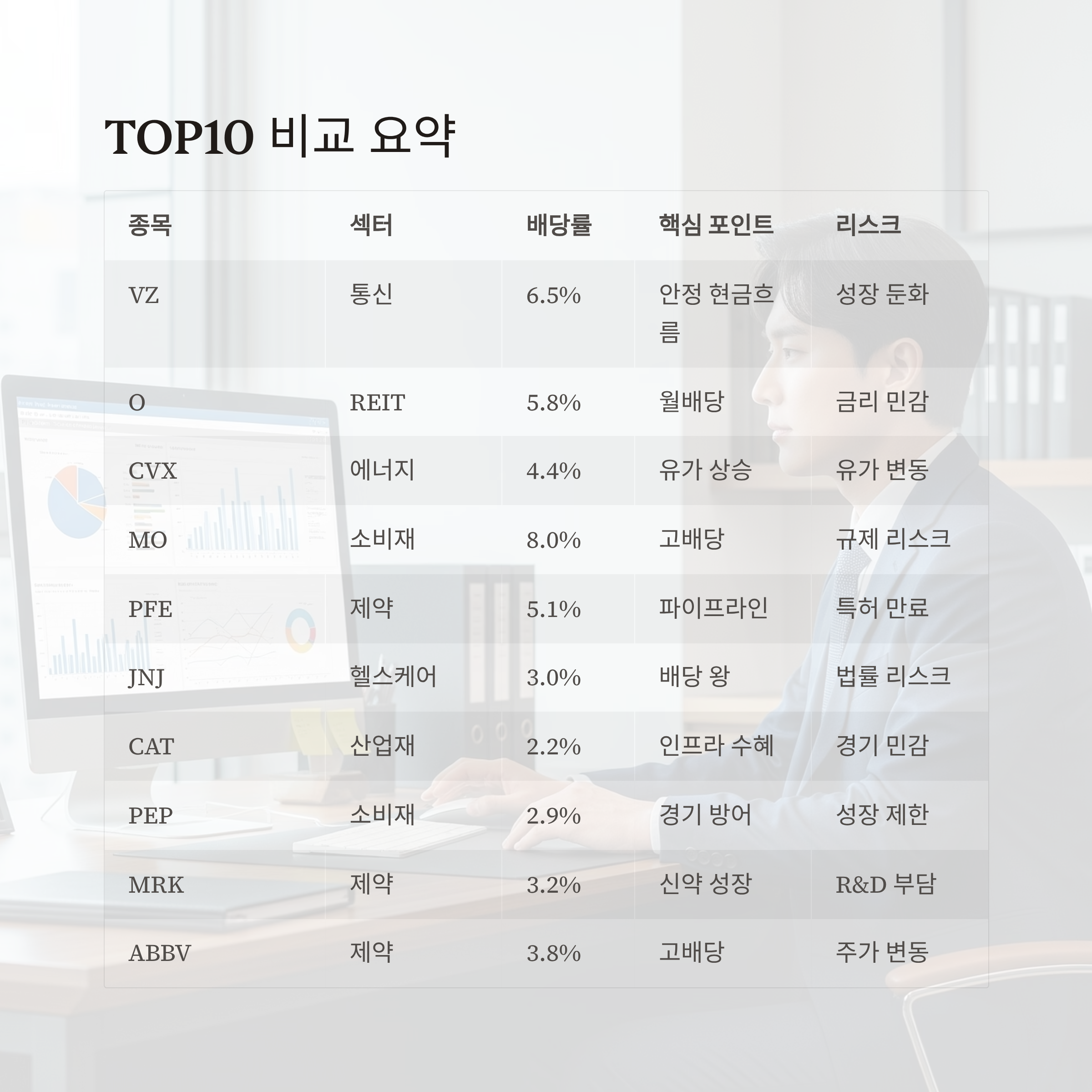 “배당만 높은 주식”이 아닌, 배당도 주고 주가도 오를 가능성이 있는 종목이야말로 진짜 투자 가치가 있습니다. 이 글에서는 배당 수익률 + 배당 안정성 + 자본이득 가능성까지 고려한 미국 대표 배당주 TOP10을 선정하고, 각 종목별 강점과 유의할 점까지 정리해봤습니다.