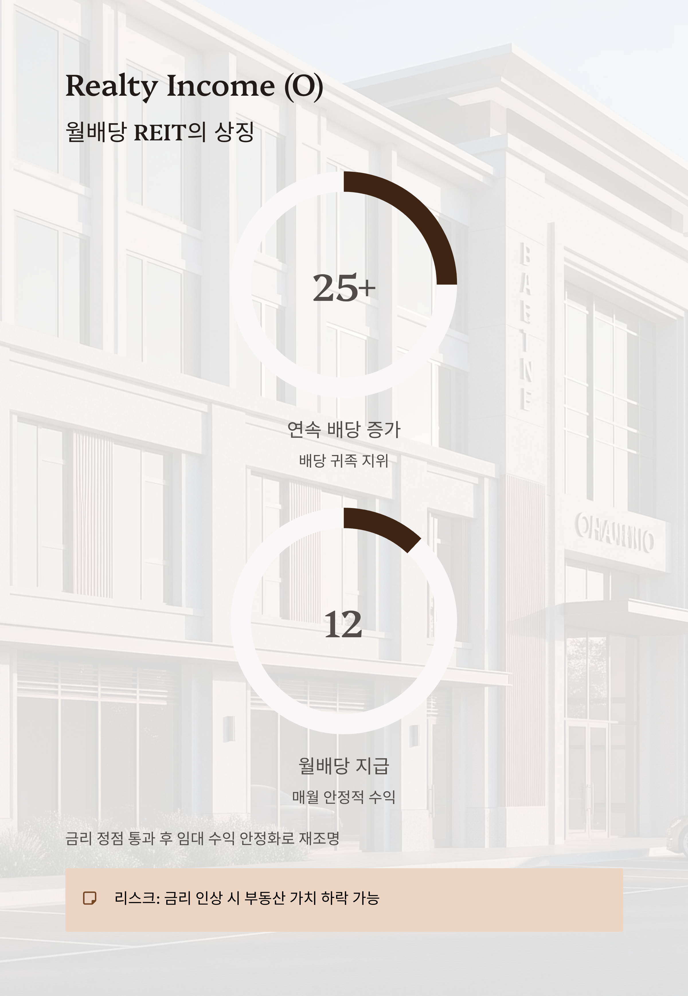 Realty Income (O) | 리츠(REIT) | 약 5.8% | 월배당 / 배당 귀족 | 금리 민감 / 부동산 경기 |