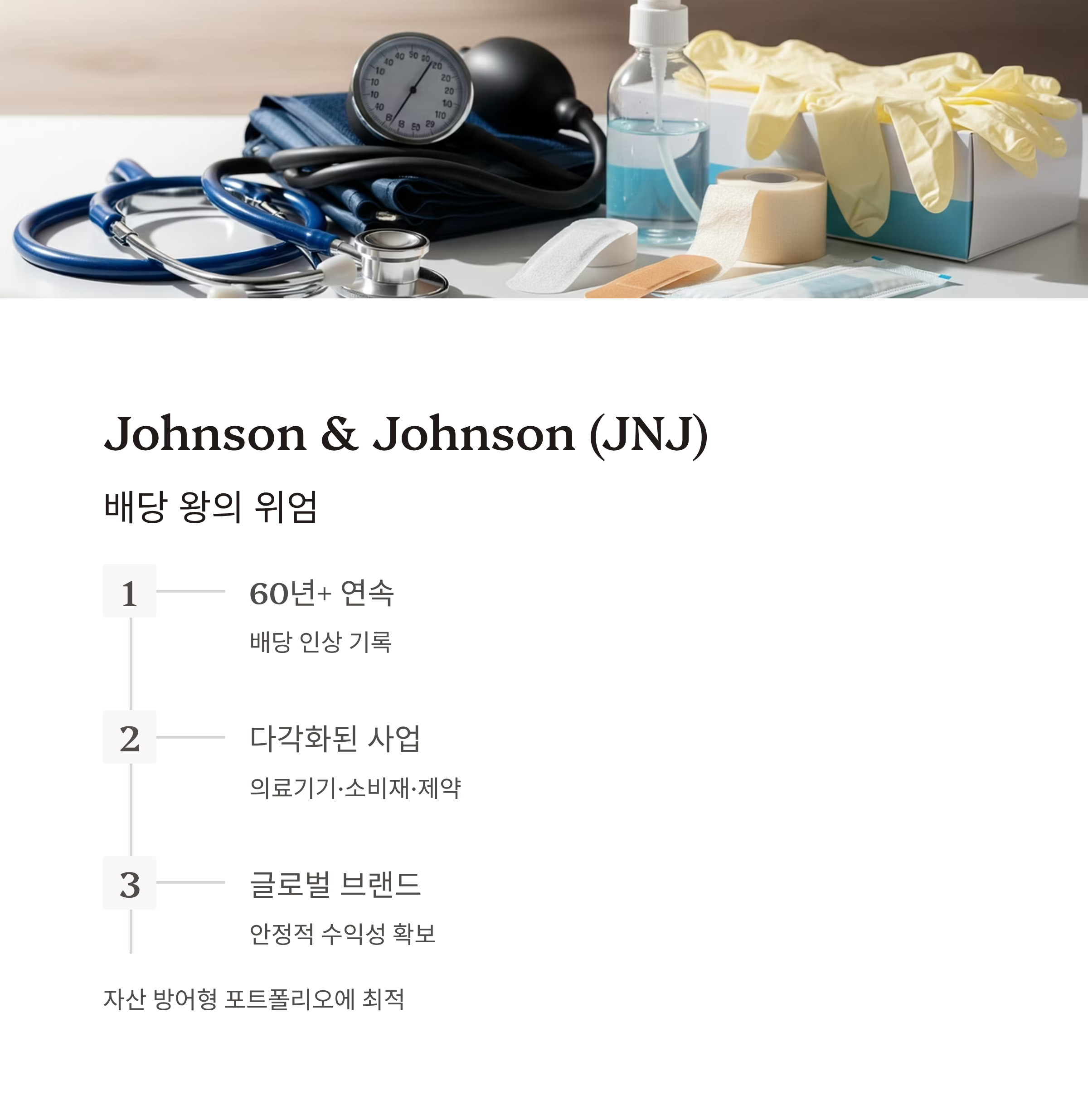60년 이상 연속 배당 인상을 기록한 '배당 왕(Dividend King)'입니다. 의료기기, 소비재, 제약 등 다양한 사업군을 보유하고 있으며, 안정적 수익성과 글로벌 브랜드 파워가 투자 매력으로 꼽힙니다.