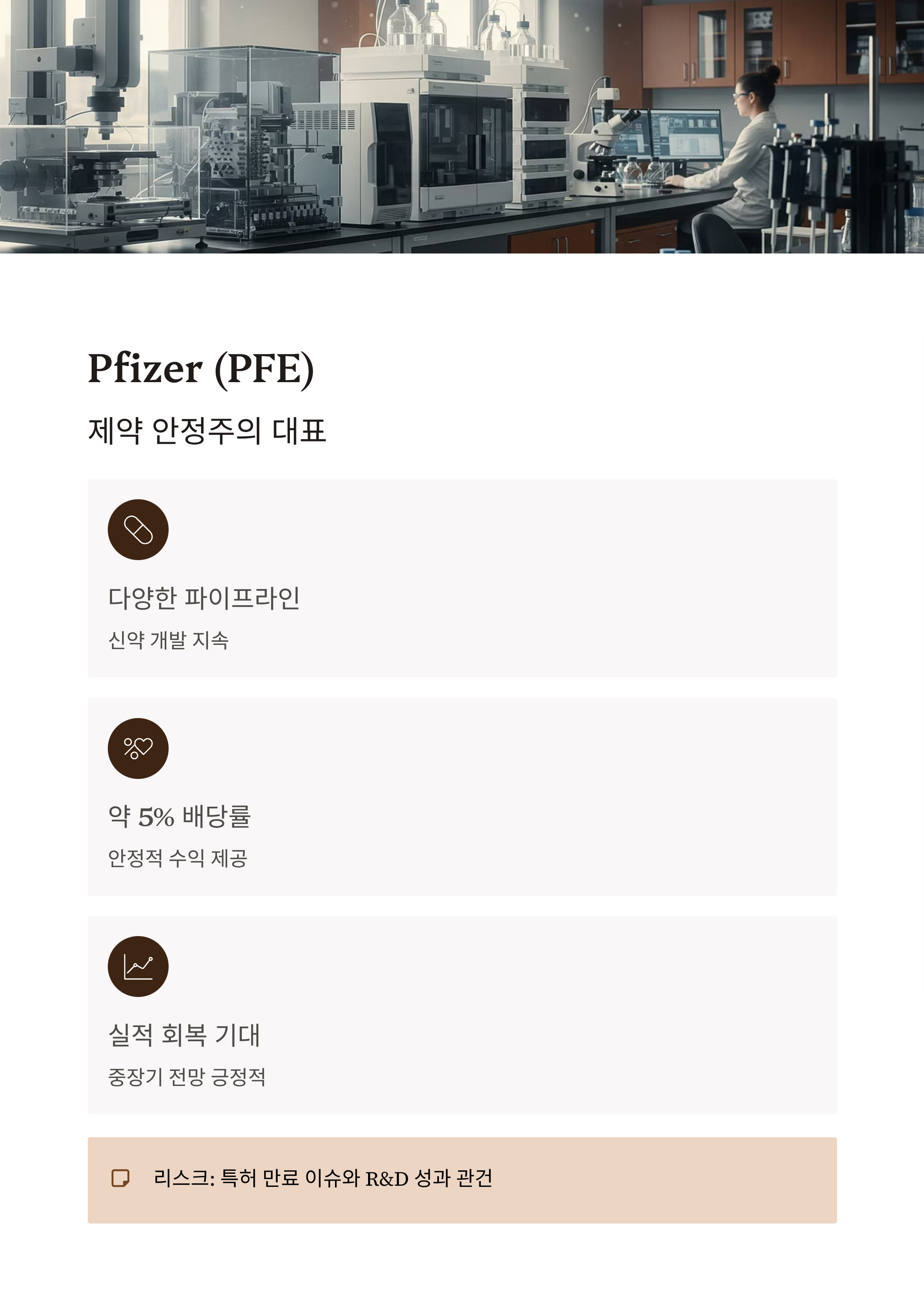 | Pfizer (PFE) | 제약 | 약 5.1% | 탄탄한 파이프라인 + 배당 안정성 | 실적 조정 중 / 특허 만료 |
