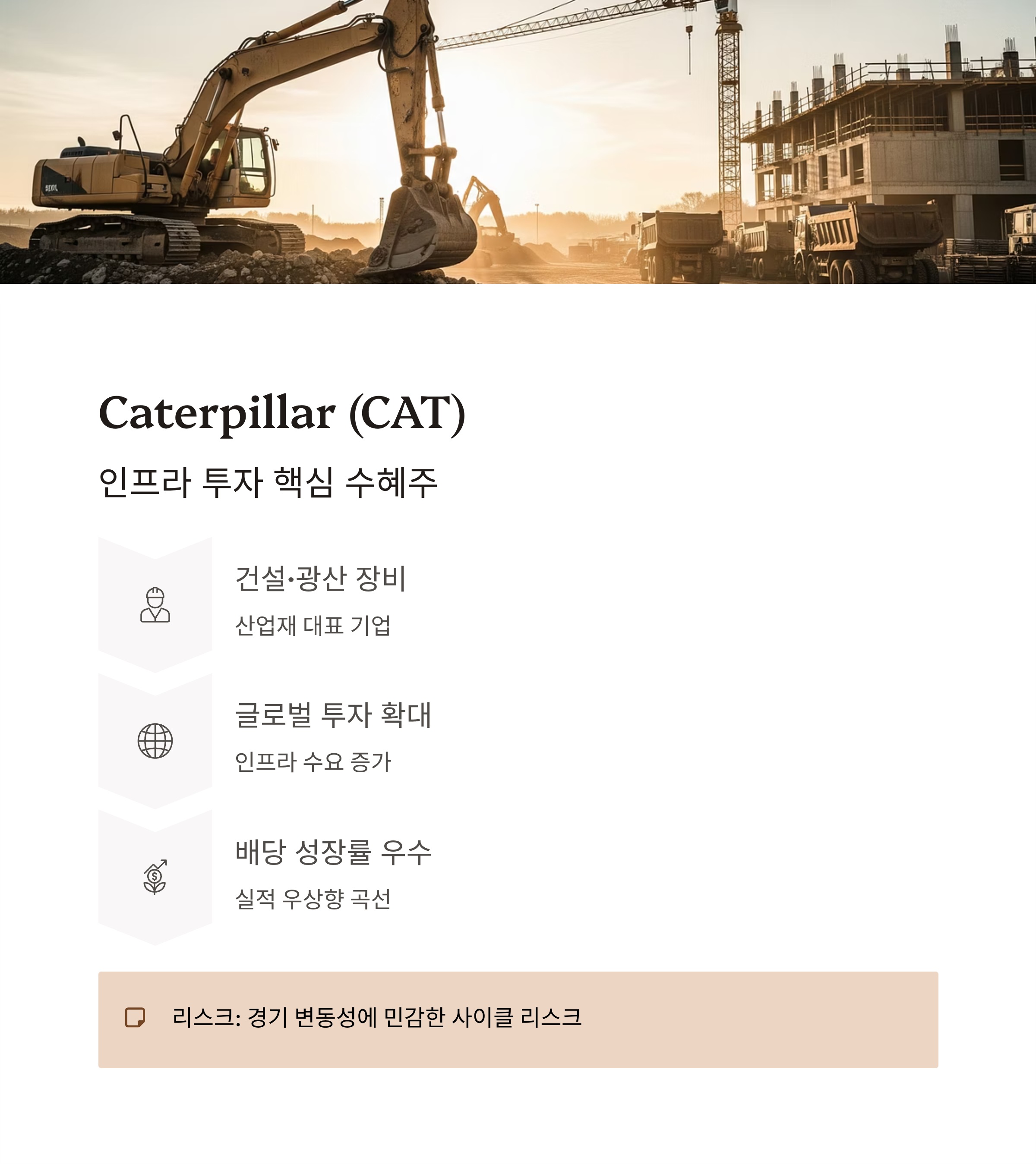 | Caterpillar (CAT) | 산업재 | 약 2.2% | 인프라 투자 수혜 + 배당 성장 | 경기 민감도 높음 |