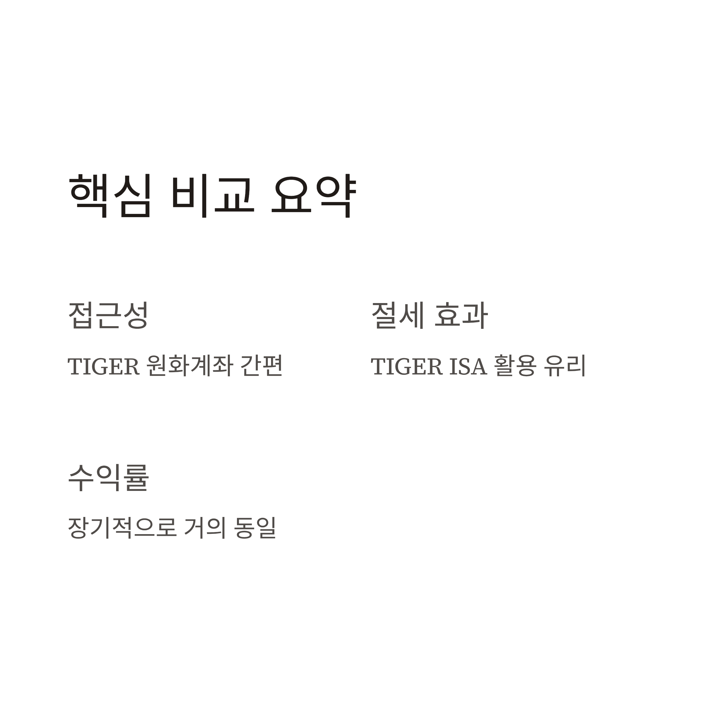 - 두 ETF 모두 동일한 지수를 추종하므로 장기적으로 수익률은 거의 유사합니다.