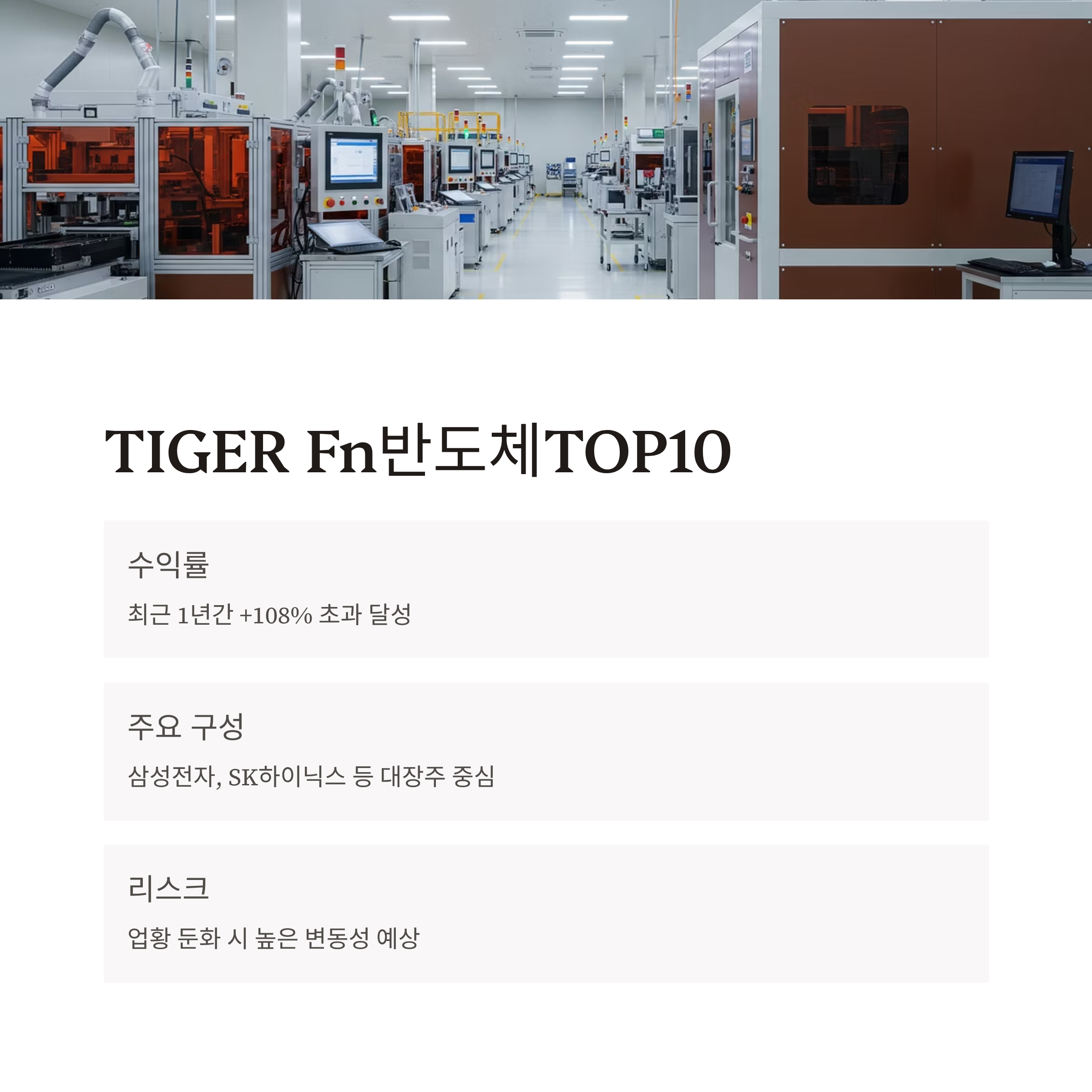 | Fn반도체TOP10 | 약 +108.84% (1년) | 0.51% | 대형 반도체주 중심, 업황 회복 반영 |