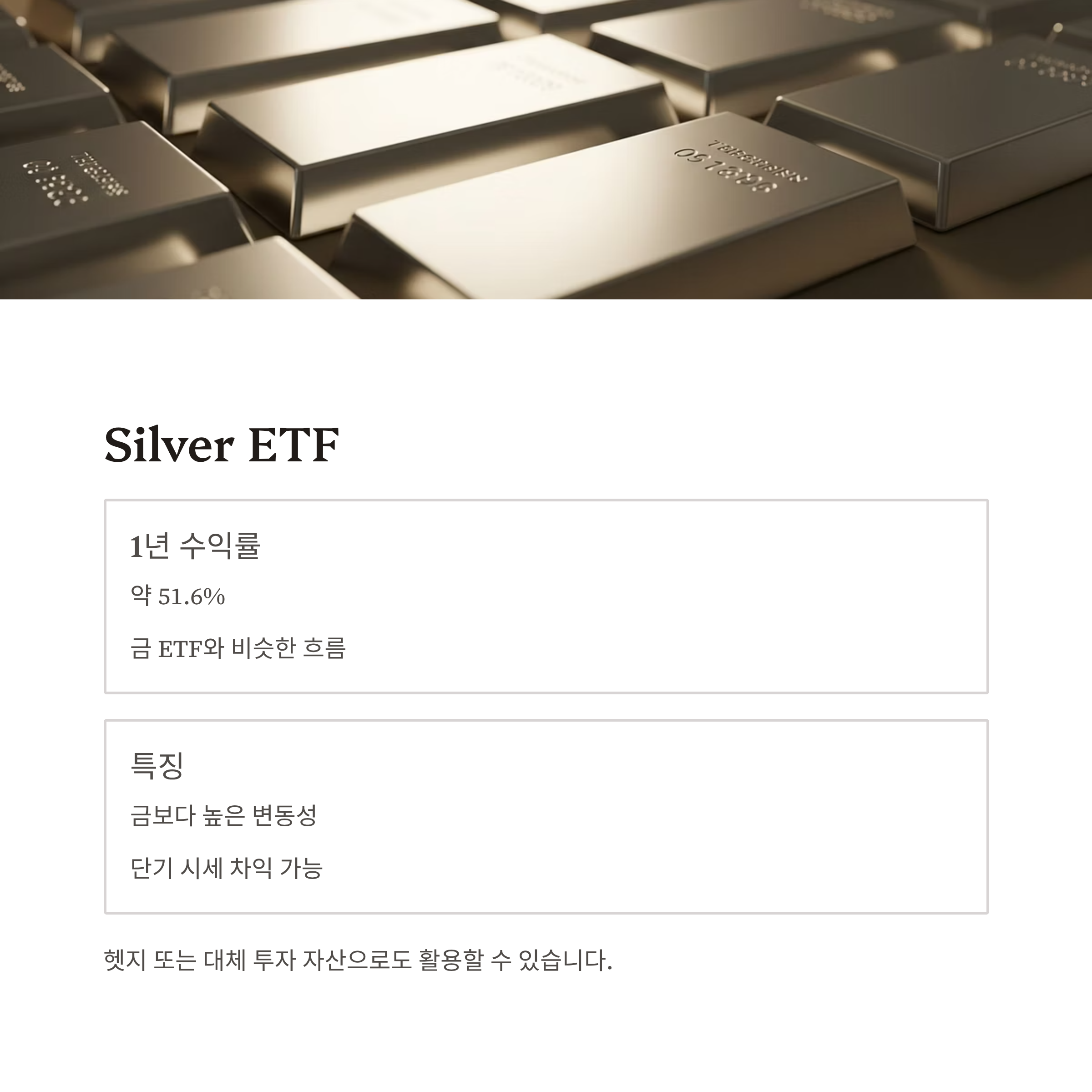 최근 1년 수익률은 약 51.6퍼센트로 금 ETF와 비슷한 흐름을 보였습니다. 다만 은은 금보다 가격 변동성이 큰 특성이 있어 단기 시세 차익을 노리는 투자자에게 더 적합합니다. 헷지 또는 대체 투자 자산으로도 쓸 수 있습니다.