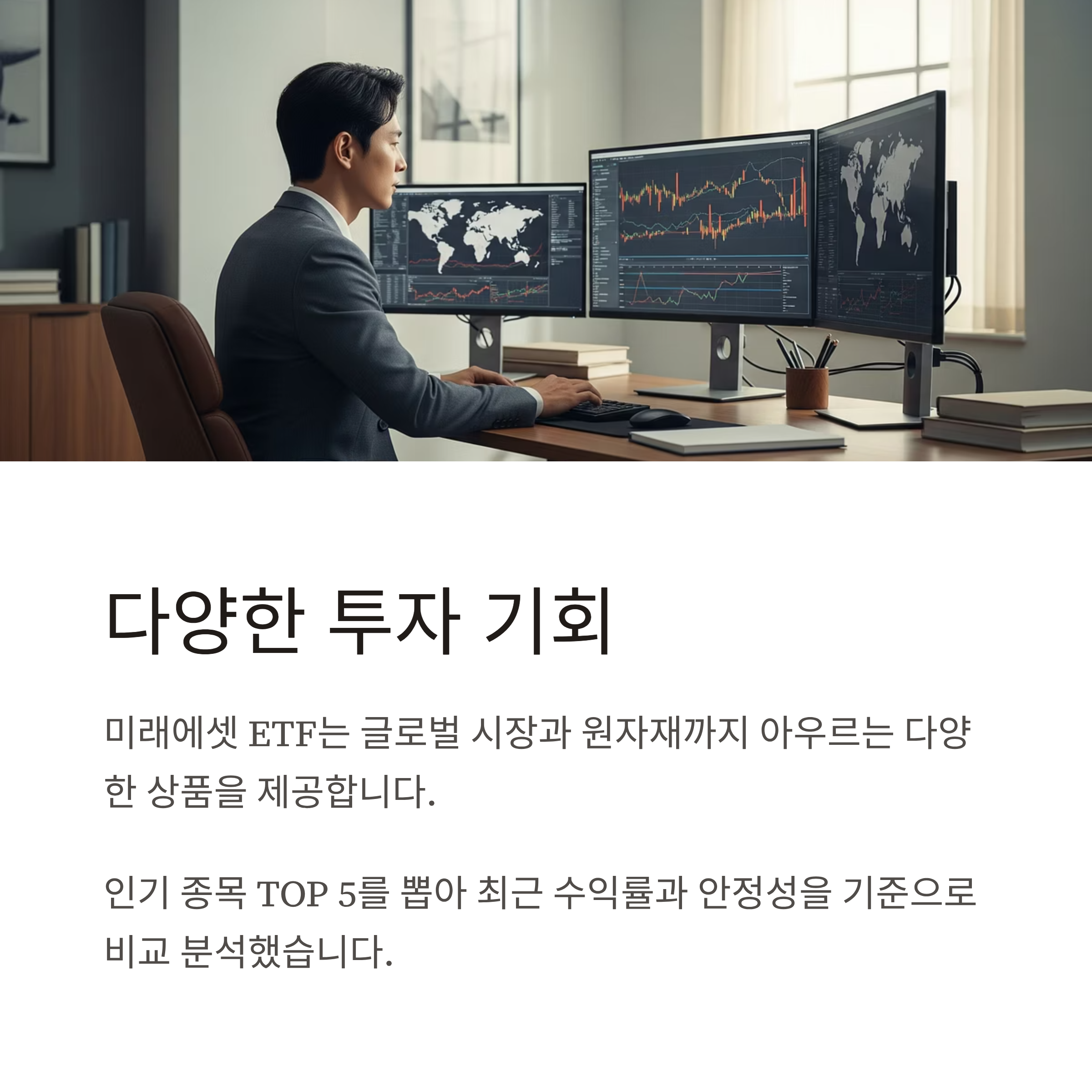 미래에셋 ETF는 글로벌 시장과 원자재까지 아우르는 다양한 상품을 제공하며 투자자들의 관심을 끌고 있습니다. 이번 글에서는 인기 종목 TOP 5를 뽑아 최근 수익률과 안정성을 기준으로 비교하고, 투자 성향별 추천 포인트를 정리했습니다.