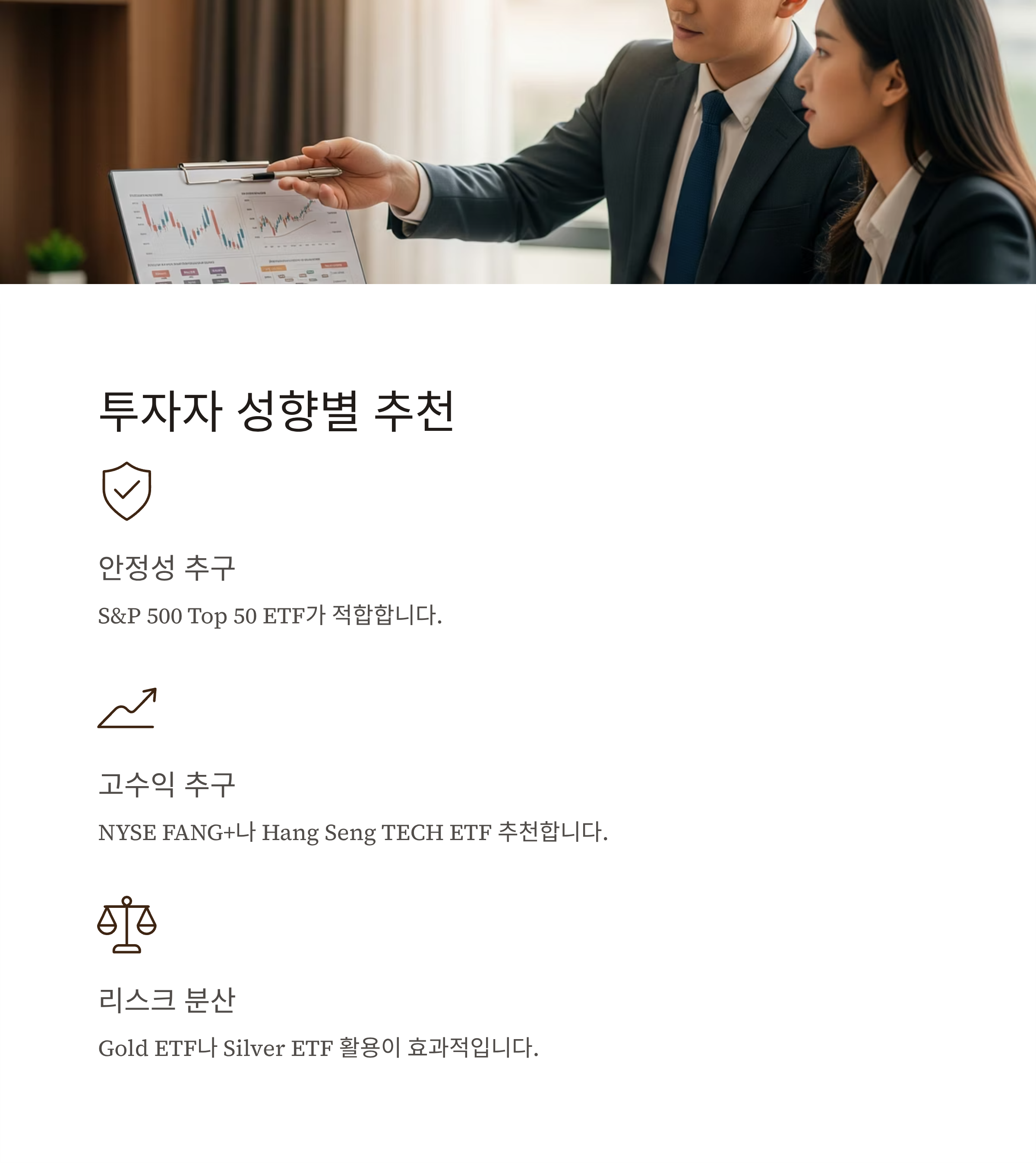 안정성과 꾸준한 성장을 원한다면 S&P 500 Top 50 ETF가 적합합니다. 고수익을 노린다면 NYSE FANG+나 Hang Seng TECH ETF가 대표적입니다. 반대로 포트폴리오의 리스크 분산과 헷지 목적이라면 Gold ETF나 Silver ETF를 활용하는 것이 효과적입니다.