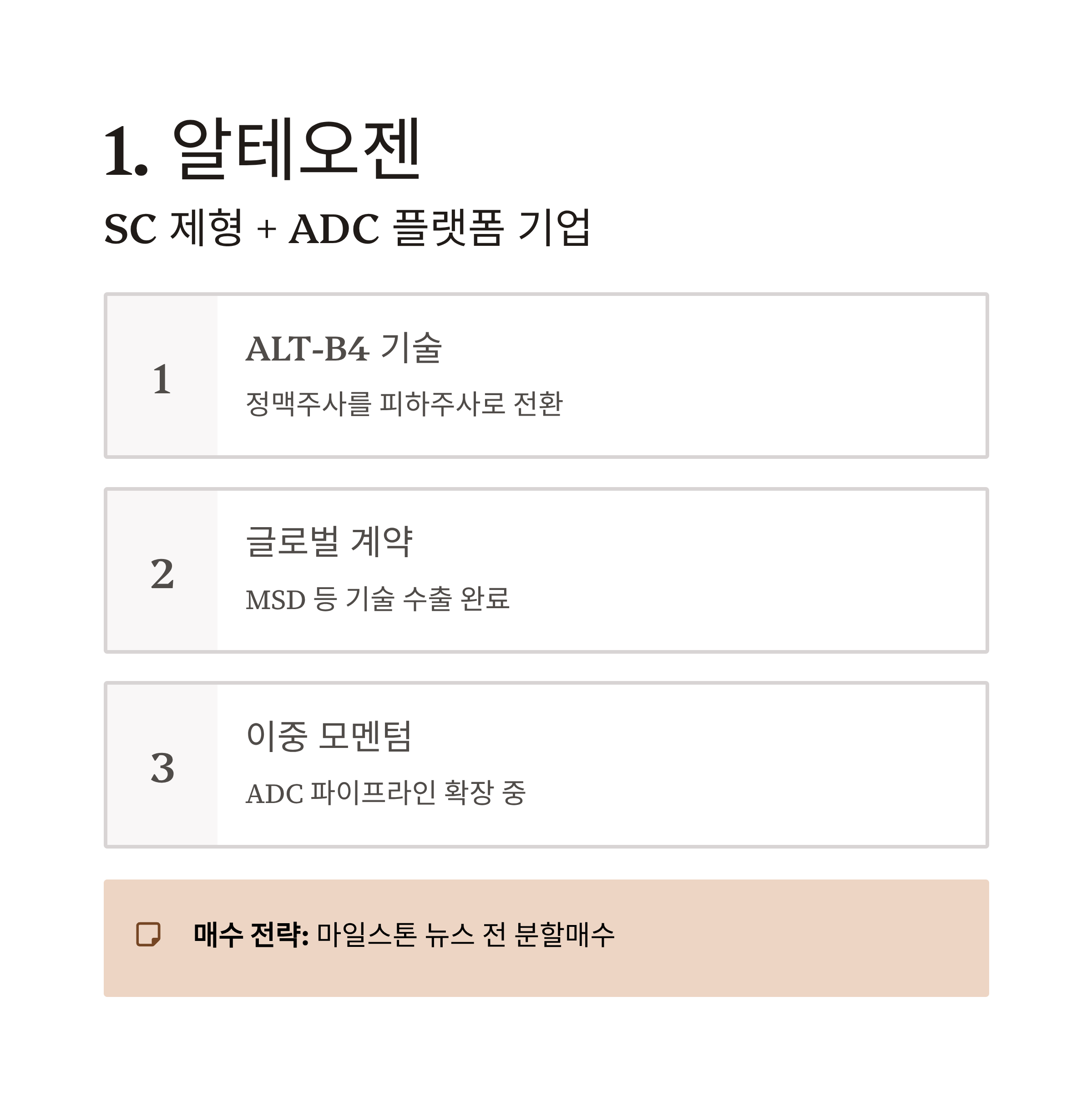 | 알테오젠 | SC 제형 + ADC | 기술 수출 대비 낮은 시가총액 | 상업화 전 불확실성 | 마일스톤 전 선매수 |
