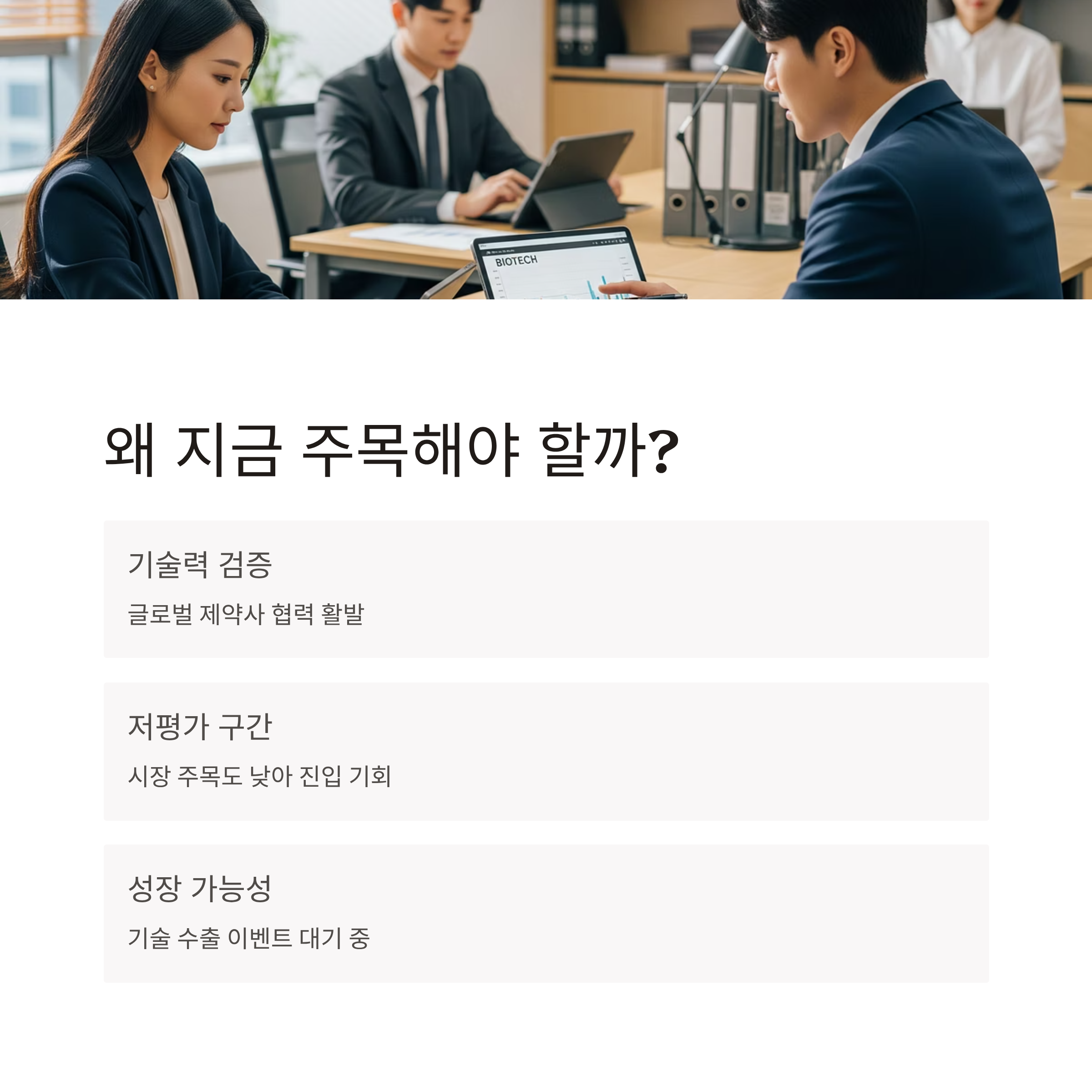 국내 바이오 산업은 여전히 성장 가능성이 풍부한 분야입니다. 그러나 임상 실패, 인허가 지연, 시장의 기대치 미달 등 다양한 이유로 주가가 큰 폭으로 하락하거나 정체돼 있는 기업들이 많죠. 그중에서도 기술력은 충분하지만 시장에서 저평가된 기업들을 잘 골라낸다면, 글로벌 기술 수출(L/O)이나 임상 성공 이벤트가 발생했을 때 폭발적인 주가 상승을 기대할 수 있습니다.
