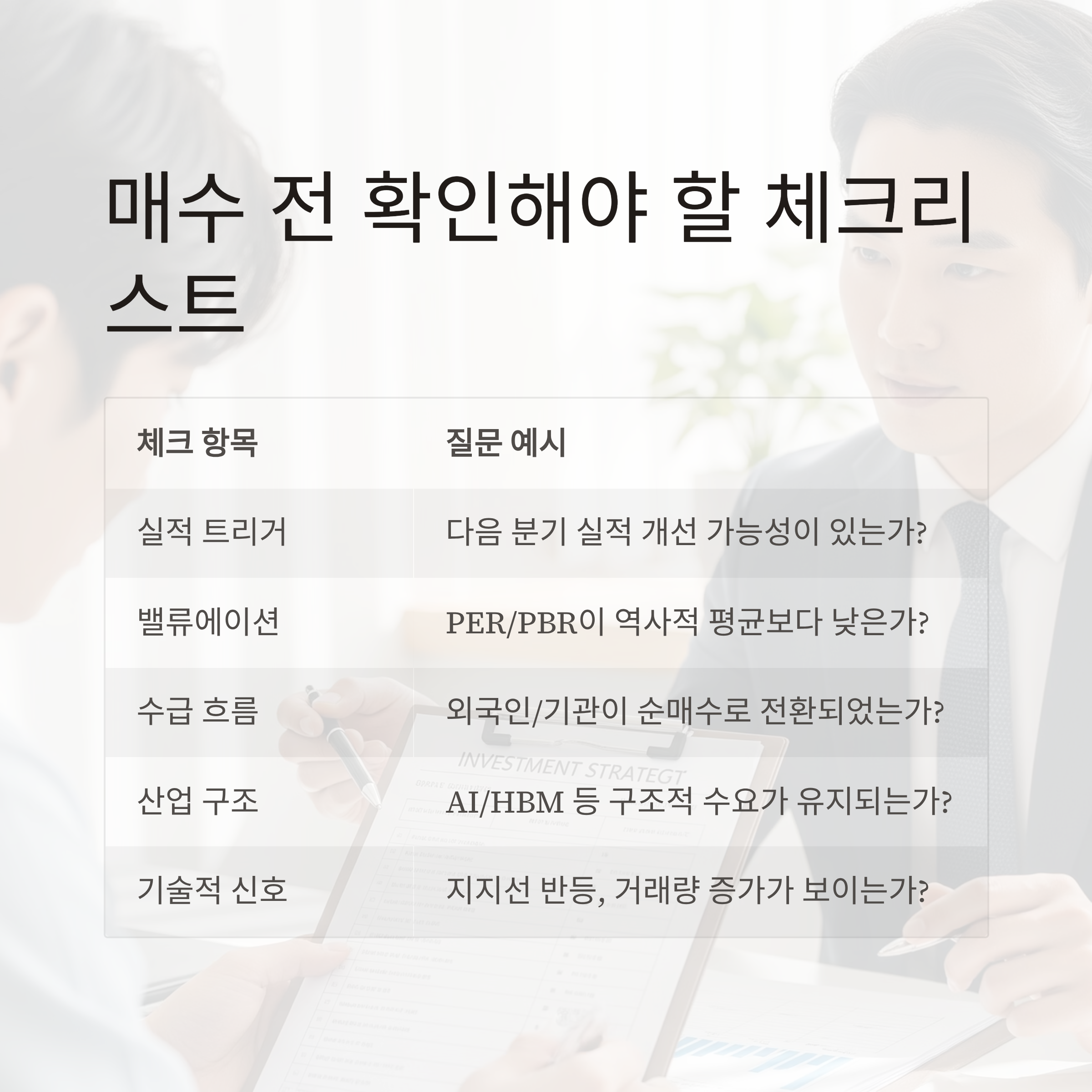 삼성전자와 SK하이닉스 등 반도체 대표 종목들이 최근 조정 흐름을 보이며 투자자들의 관심이 다시 집중되고 있습니다. "지금이 저점 매수 기회일까?"라는 질문에 답하기 위해, 전문가들이 제시하는 핵심 조건과 체크리스트를 정리해보았습니다. 실적, 수급, 산업 전망 등 다양한 측면에서 접근해보세요.