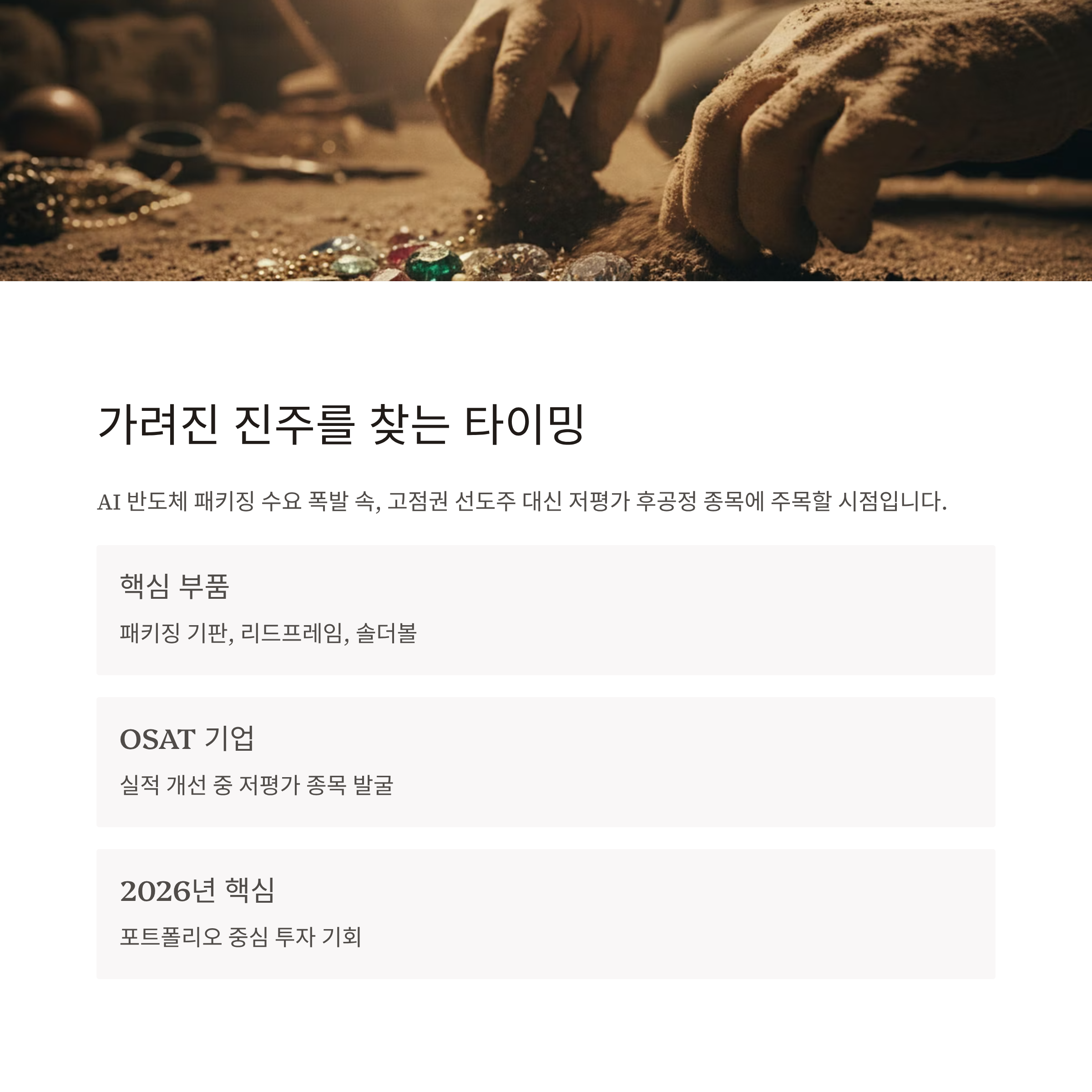 AI 반도체의 패키징 수요가 폭발적으로 증가하는 가운데, 기존 선도주들의 주가가 고점권에 접어든 지금은 오히려 ‘가려진 진주’들을 찾는 타이밍입니다. 특히 패키징 기판, 리드프레임, 감쇠기, 솔더볼 등 후공정 핵심 부품 및 OSAT 기업 중, 실적이 받쳐주면서도 여전히 저평가되어 있는 종목들은 2026년 투자 포트폴리오의 핵심이 될 수 있습니다. 이번 글에서는 최근 3개월 내 증권사 목표주가 리포트를 기반으로 실제 주가가 저점에 머물고 있는 종목들을 중심으로 분석합니다.