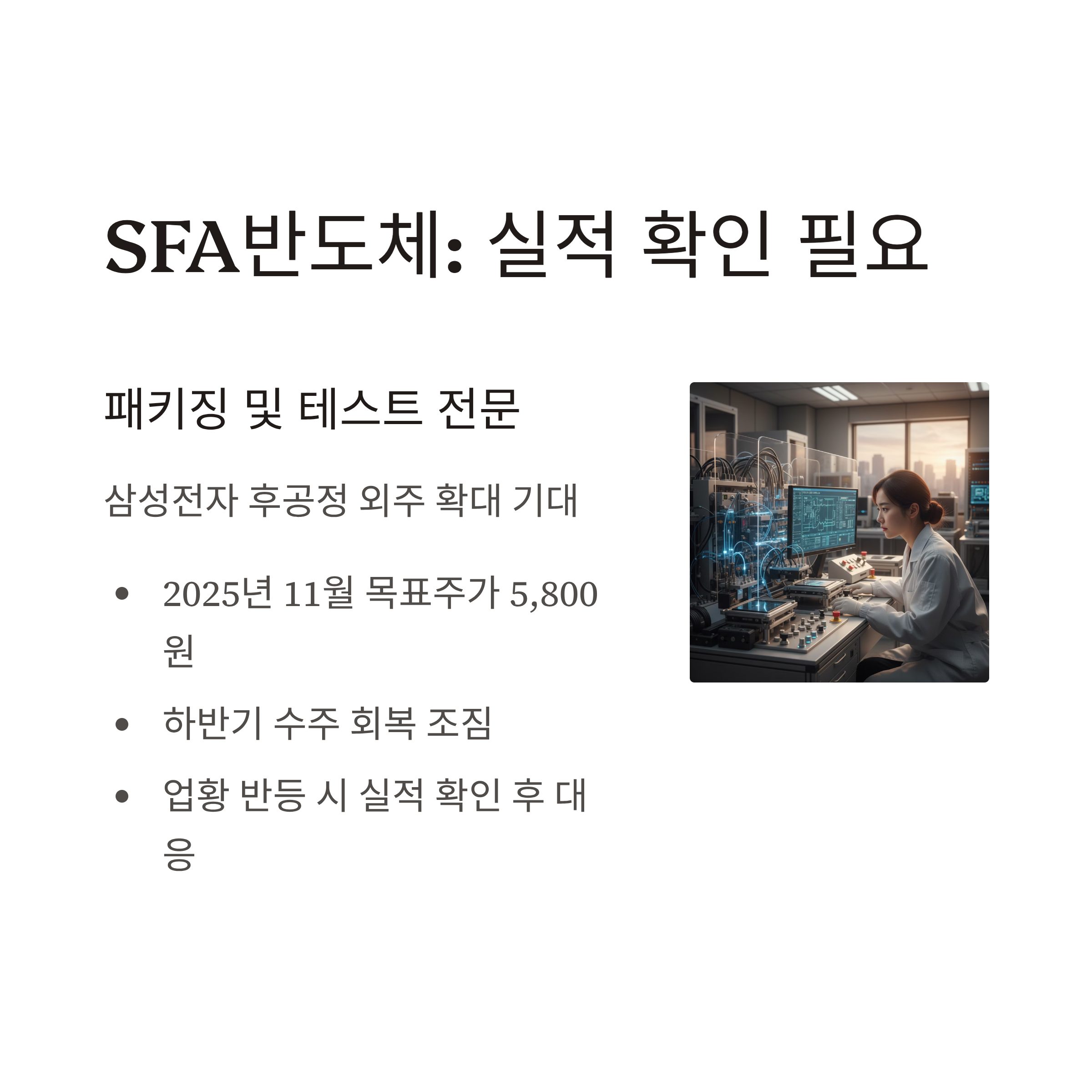 | SFA반도체 | 패키징 및 테스트 | 5,800원 | 후공정 외주 확대 기대, 실적 바닥 확인 필요 |