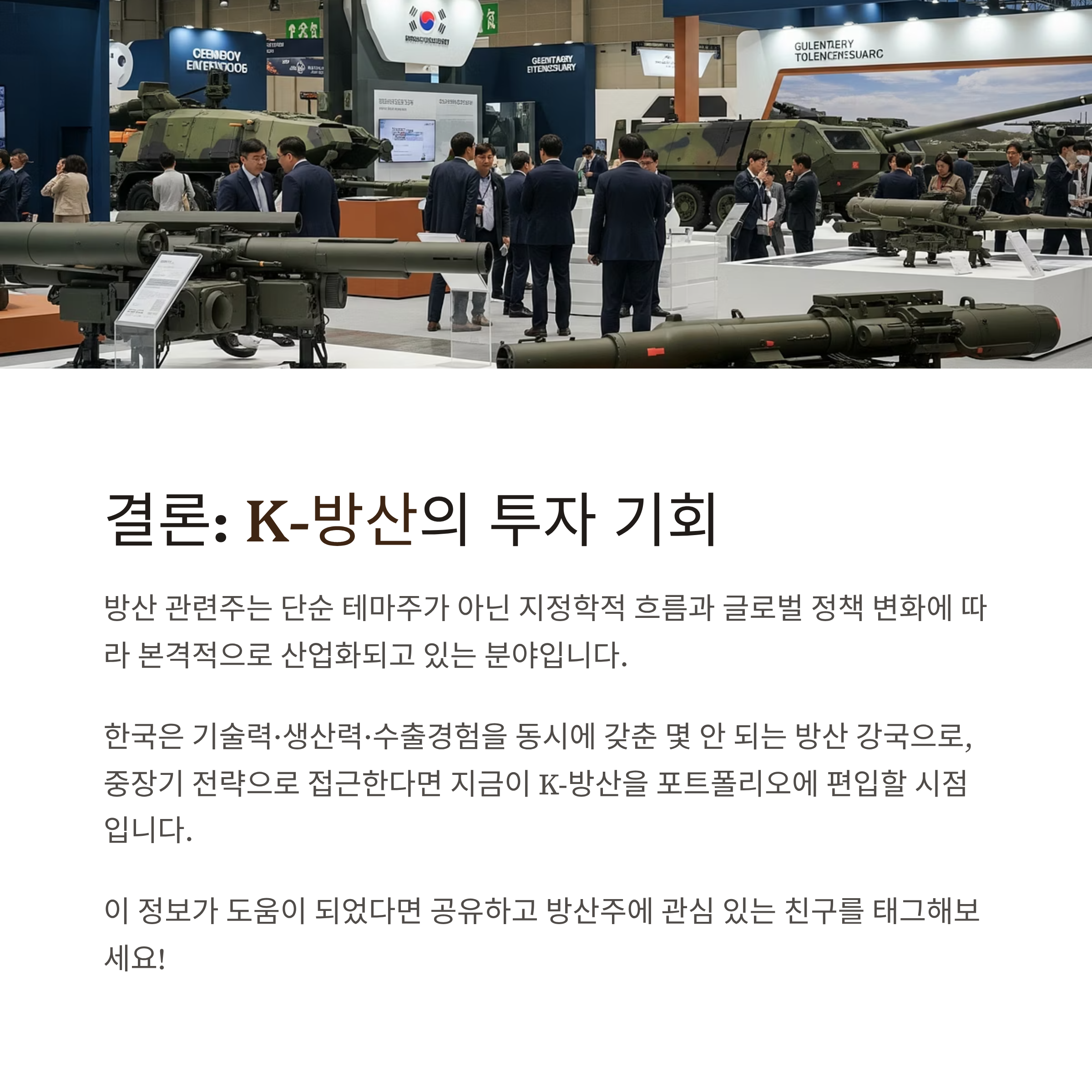 중장기 전략으로 접근한다면 지금은 K-방산을 포트폴리오에 편입할 수 있는 시점일 수 있습니다.