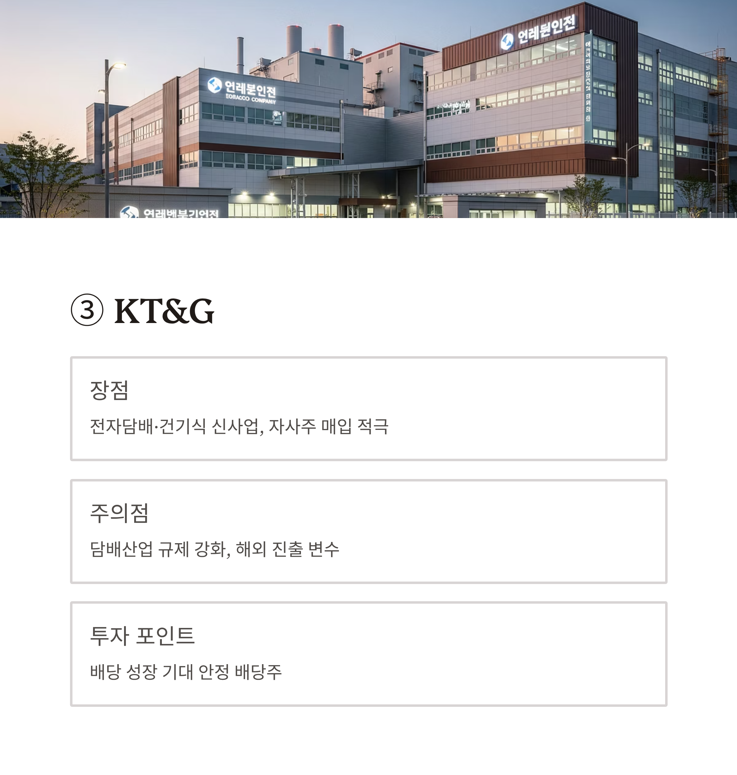 - 장점: 전자담배·건기식 신사업 확대 + 자사주 매입 등 적극적 주주환원