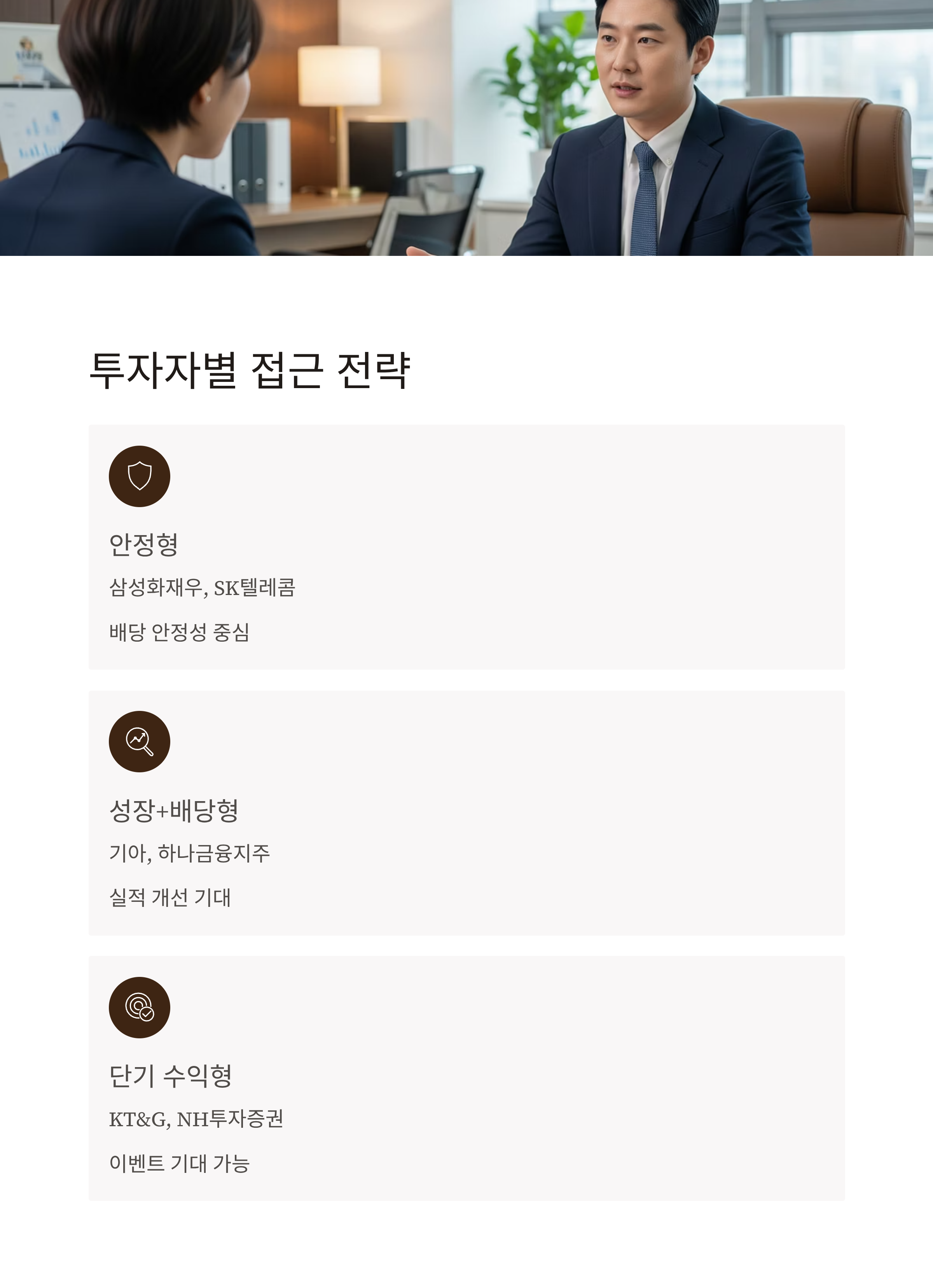 | 단기 수익 중심 | KT&G, NH투자증권 | 배당과 함께 단기 이벤트 기대 가능 (예: 자사주 매입 등) |