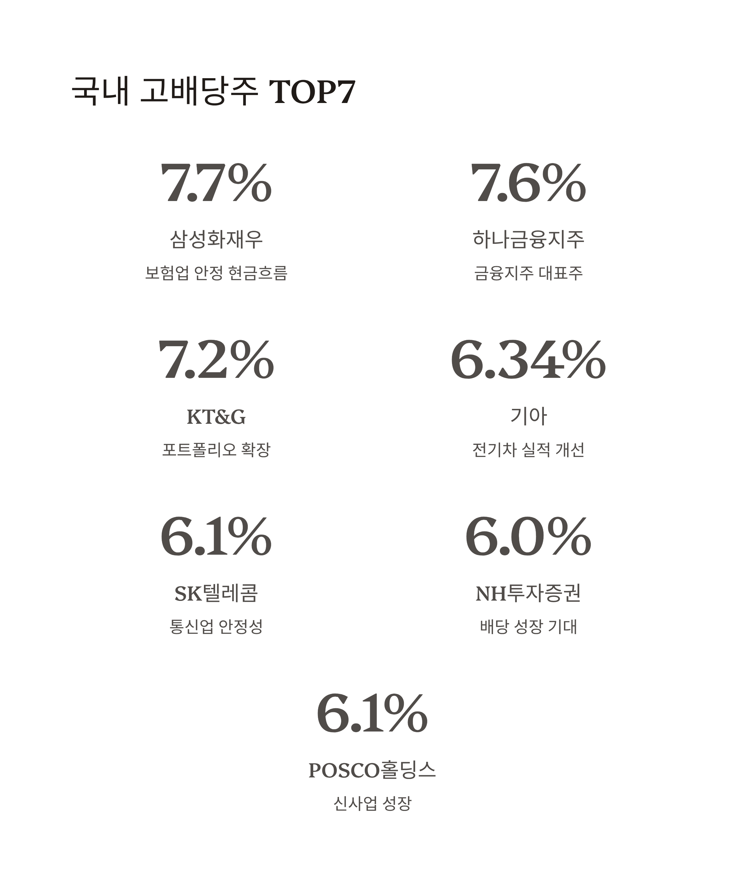 | POSCO홀딩스 | 약 6.1% | 철강·소재 전통강자, 배터리소재 등 신사업 성장 기대 | 약 4~7% |